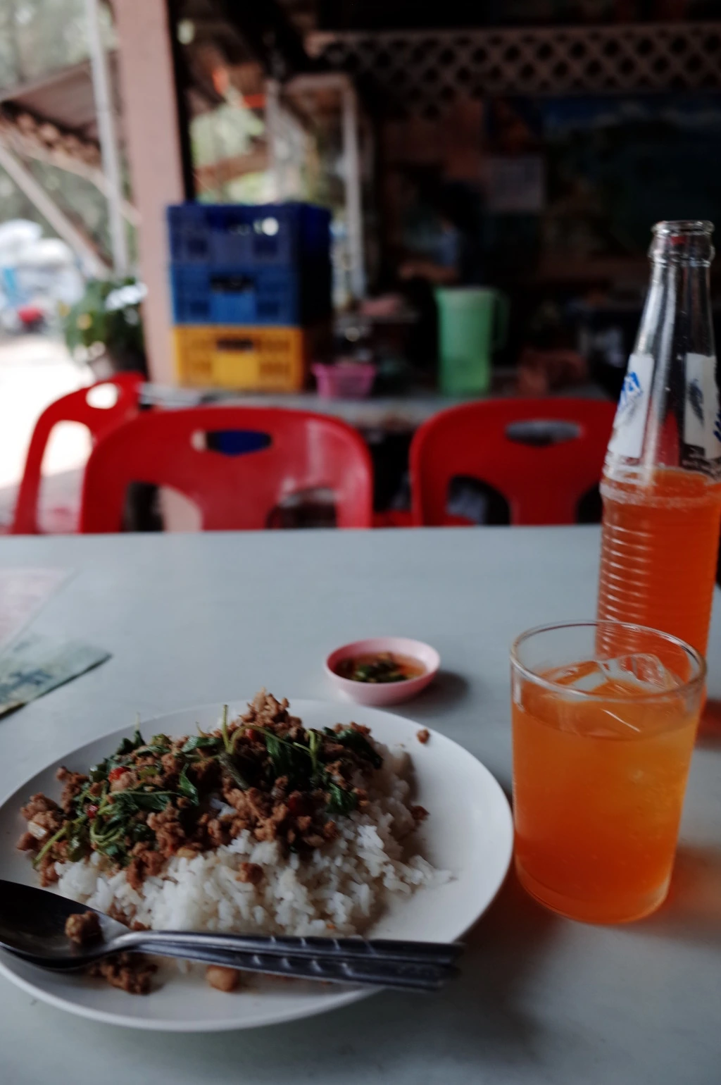 1시 반 출발이니 30분 정도 남았다. 후딱 밥을 먹고 와야 해서 돌아보니 식당이 여러 개 보인다. 그중 대충 아무 데나 들어가서 메뉴를 보고 고른다. 태국 온 이후에 향음식을 제대로 못 먹어서 바질이 들어간 볶음밥을 골라본다.
