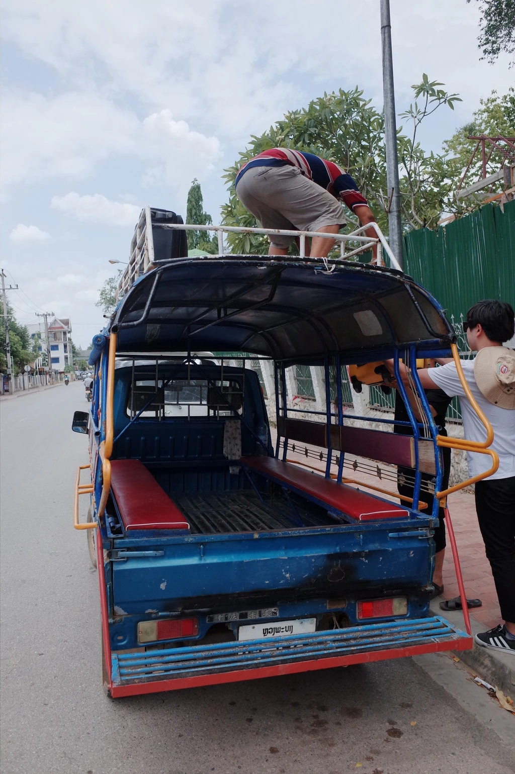 뭐 많은 가격은 아니지만 그래도 네고를 좀 해본다. 뚝뚝을 9명 가득 채우면 인당 15,000킵까지 내려주기로 협상한다. 사람 채우는 거야 여기 사람들 모으면 되니 금방이다. 그때 마침 미니버스가 한대 더 도착하고 그 안에서 한국인들이 우루루 내린다.