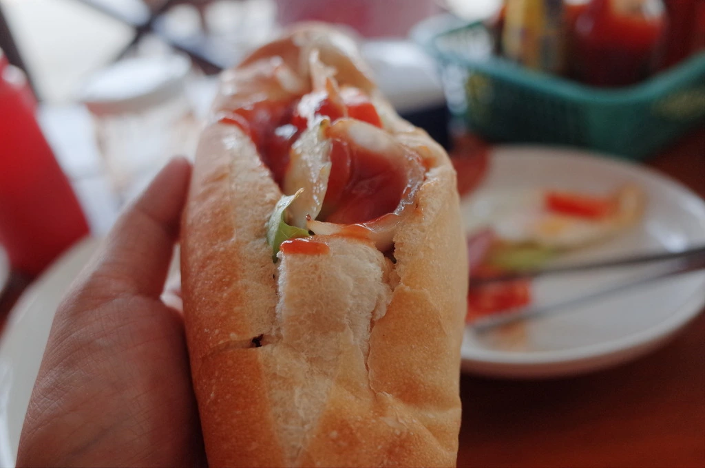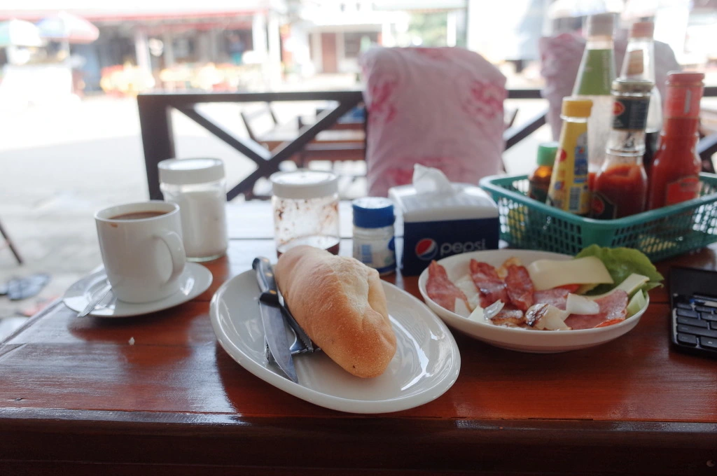 음식이 나온다. 이 음식은 샌드위치의 구성품을 따로 주니 알아서 합체해 먹으라는 걸까. 빵과 베이컨, 계란 그리고 각종 야채가 따로 나온다. 프랑스 식민지였던 이곳은 바게트가 굉장히 많이 보인다. 일단 바게트 가운데를 칼로 잘라서 주어진 재료들을 다 쑤셔 넣는다. 그리고 케첩을 뿌리고 크게 한입 베어서 뜯어낸다.