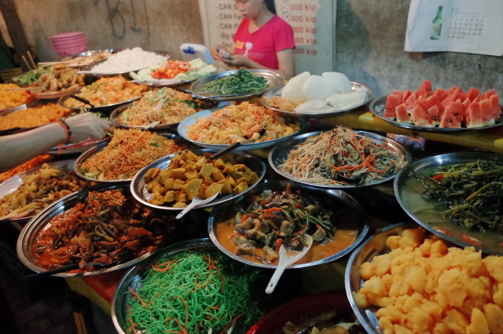 첫 번째 골목으로 들어가본다. 여기는 먹자골목이다. 식당들이 비슷한 컨셉이다. 15,000킵에 십여 가지 음식 중에서 한 그릇에 담을 수 있는 최대한을 담아서 먹을 수 있단다. 이거나 먹어볼까?