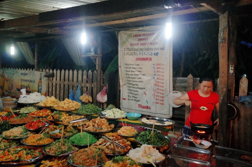 알단 구경을 좀 더 하려고 골목을 나오다 아무래도 이건 그냥 넘기기 힘든 유혹 같아서 다시 돌아간다. 뷔페 한 접시와 비어라오 작은 것을 주문하여 선불로 25,000킵을 준다. 그리고 음식들을 찬찬히 담아본다.