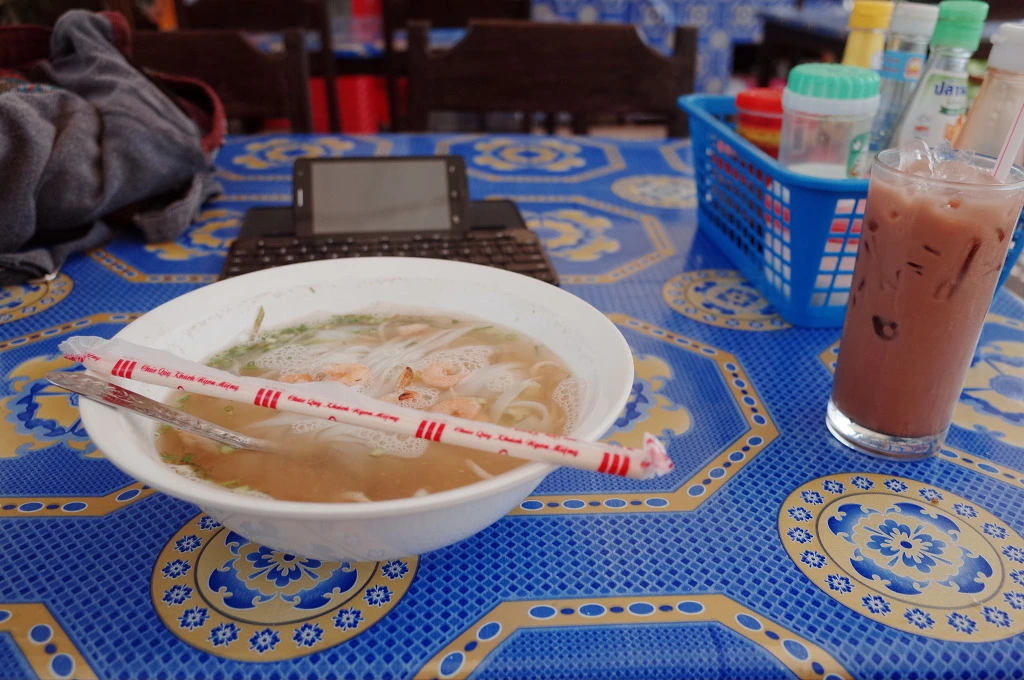 2만킵 국수와 1만킵 오바틴차를 주문한다. 비엔티안 말고는 어디든 음식 가격이 비싸다. 저녁은 제대로 먹을계획이니 점심은 그냥 때운다고 생각하며 저렴한 애들로 주문한다.