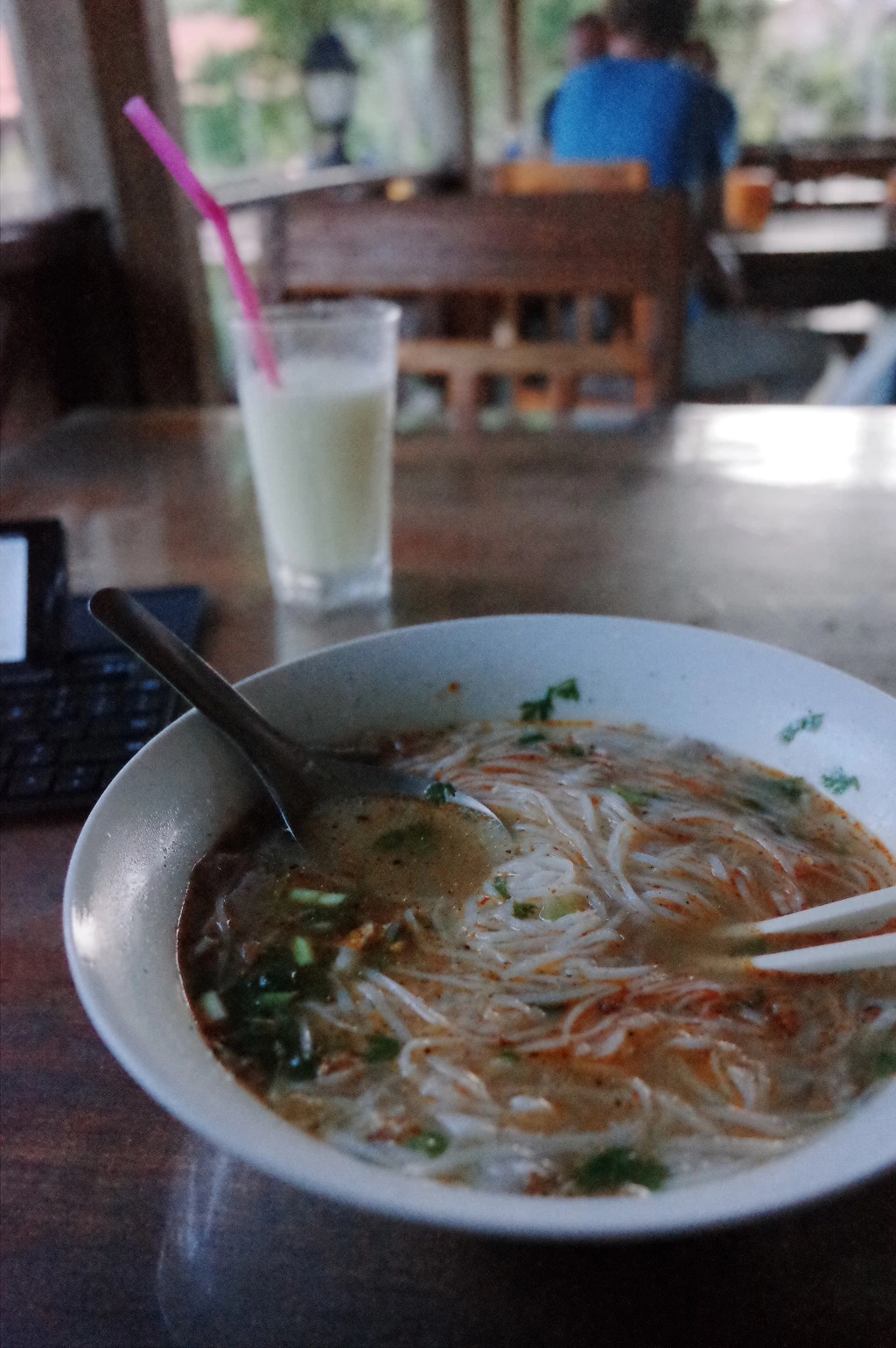 쌀국수가 15,000킵이다. 나쁘지 않다. 확실히 관광지를 벗어나니 가격이 저렴해진다. 쌀국수 하나를 주문하고 망고 쉐이크도 하나 따로 시킨다. 숙취 상황에서는 수분도 많이 섭취해야만 한다.