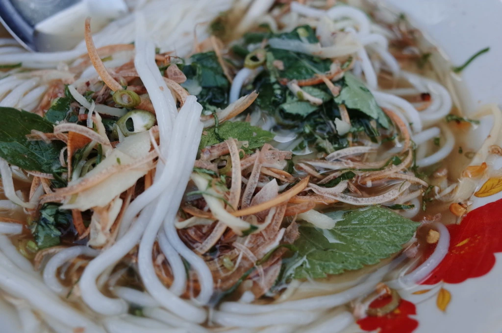 야채 위주의 국수다. 그냥 물로 헹구고 행주로 스윽스윽 닦은 그릇에 담아주신다. 원래 위생적인 거는 그다지 크게 신경 쓰지 않기에 상관없다. 국수에 배치되어 있는 여러 양념을 넣어서 최적의 맛을 만든다.