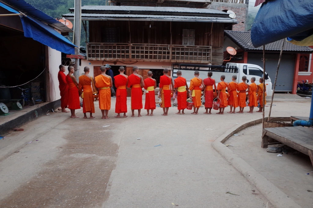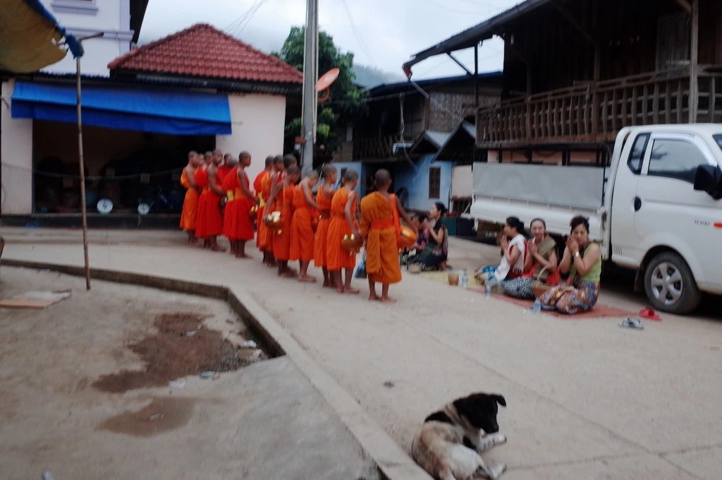 나오는데 길에 예쁘게 차려입고 손에 밥을 들은 아낙네들이 많이 보인다. 어? 말로만 듣던 탁발인가? 궁금해서 한번 서둘러 가보니 앞쪽에 스님들이 모여있고 아직도 탁발을 진행하고 있다. 루앙프라방에서도 안 봤던 탁발을 이곳에서 우연히 보게 된다.