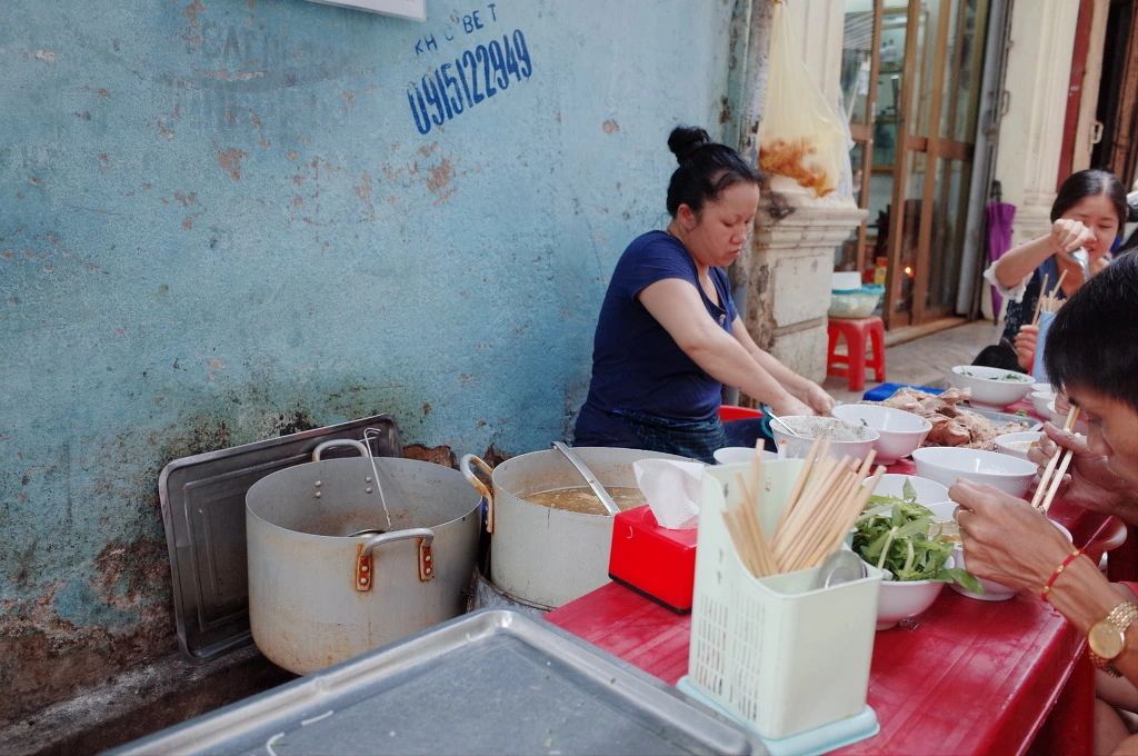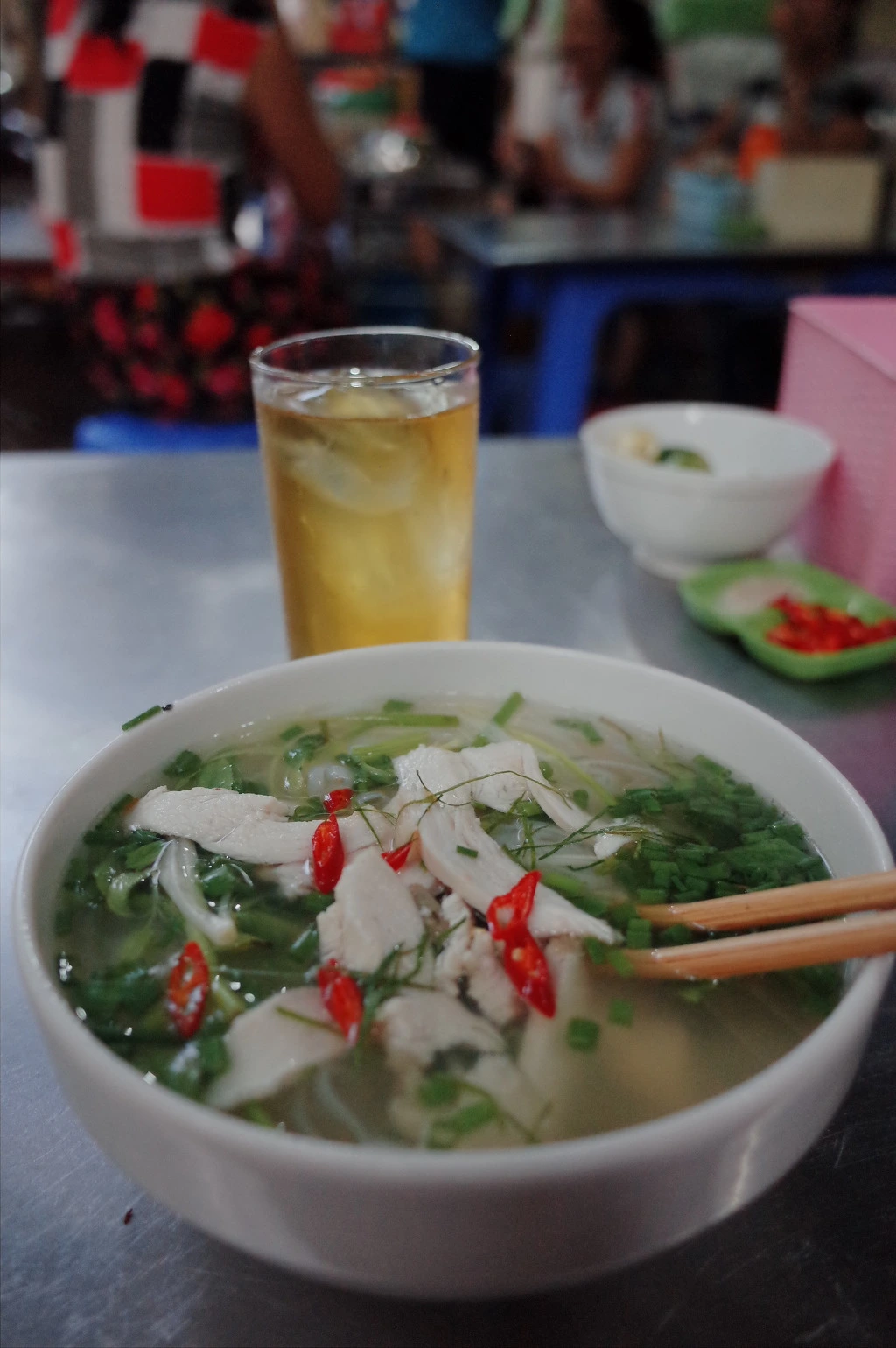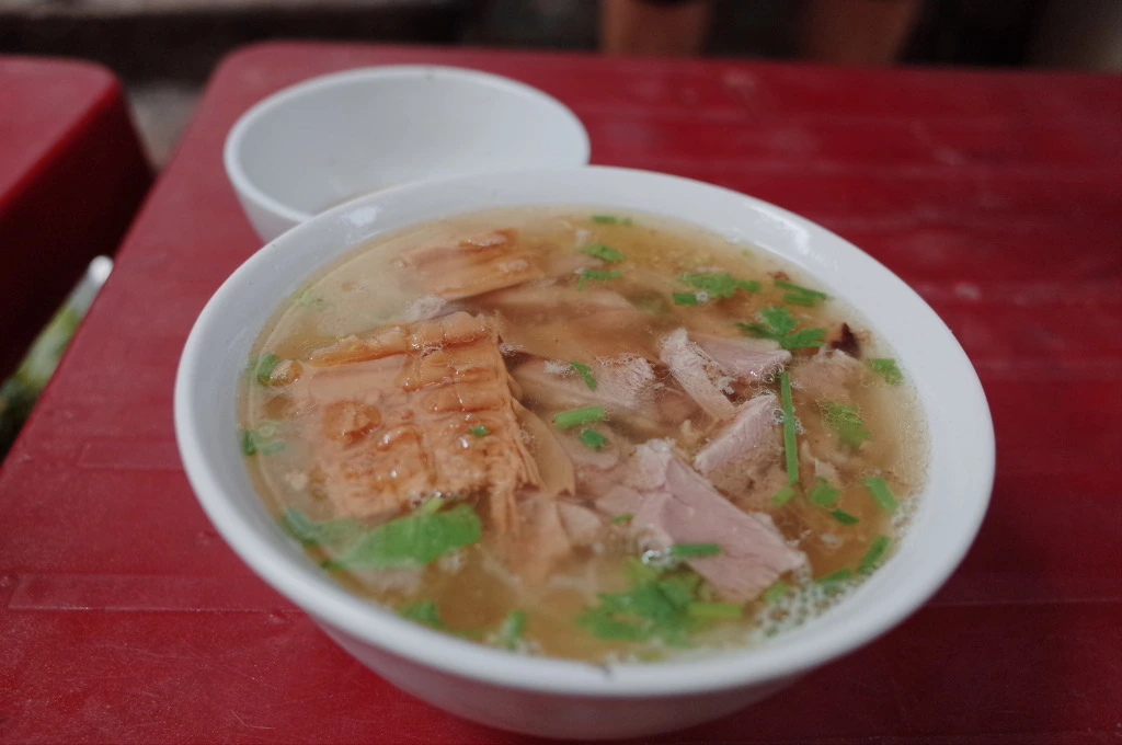 자리에 앉아서 닭 쌀국수 '퍼가'와 차가운 차인 '차다'를 주문한다. 퍼가 3만 동, 차가 3천 동이다. 여기 분차도 꽤나 괜찮더니 퍼가도 상당히 맛있다. 삶은 닭을 앞에 두고 있다가 주문하니 살을 발라서 바로 넣어준다.