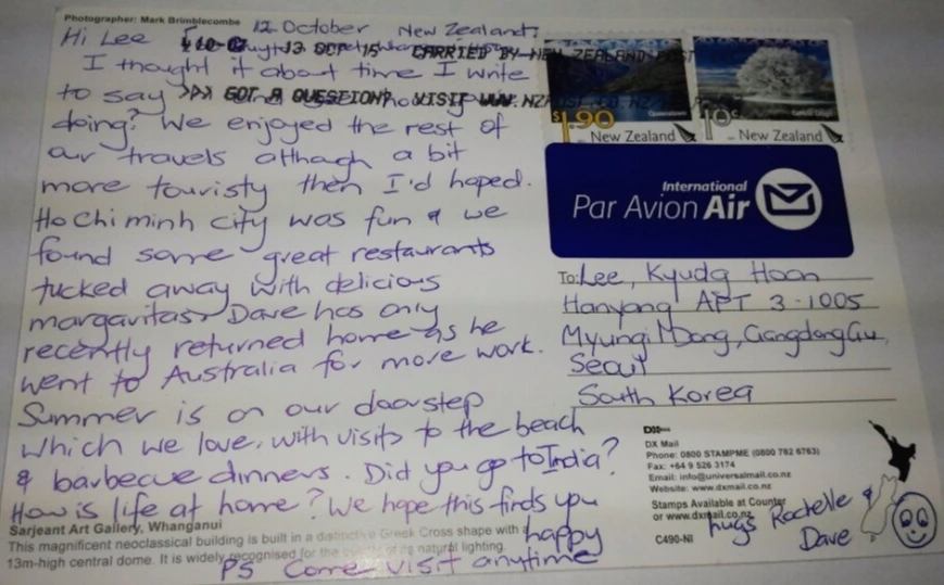 사진으로 찍은거라 잘 보이지는 않지만, 집중해서 읽어보니 데이브가 아닌 같이 다니던 라셸이 보내온 엽서다. 데이브는 나와 헤어진 후에 여행을 마치고 바로 고향인 뉴질랜드로 돌아가지 않고 호주에서 일을 마저 하고 돌아갔단다. 그 둘은 지금 뉴질랜드에 같이 있다며 나보고 언제든 오라고 라셸이 적어놨다.
