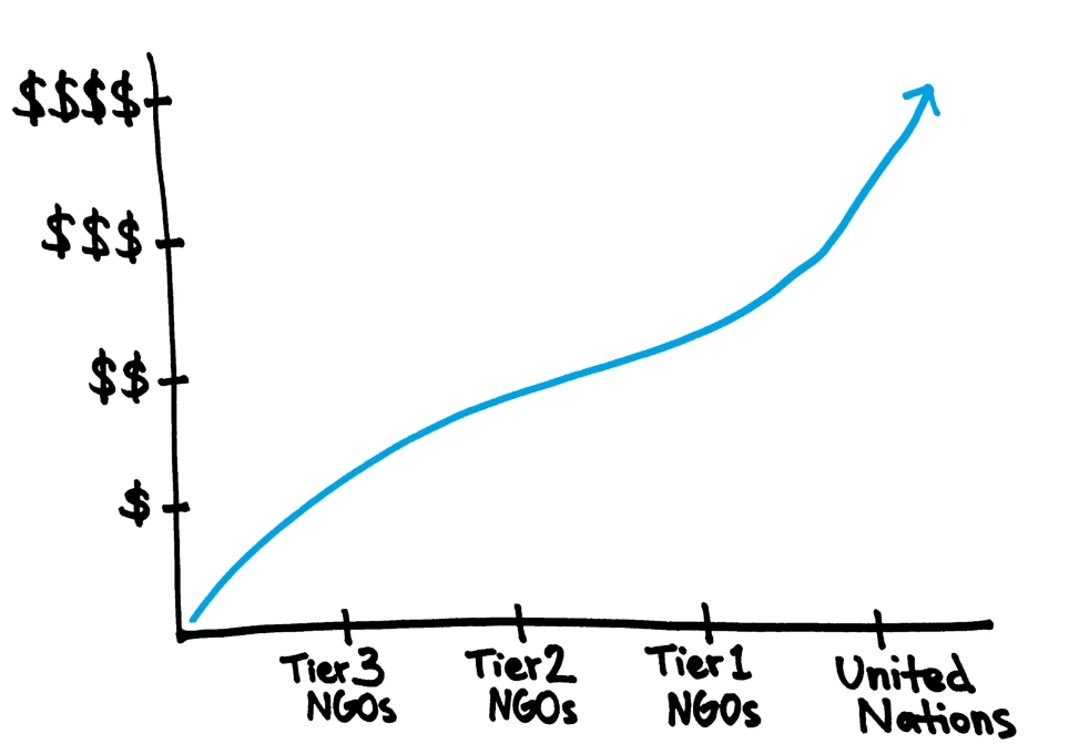 반면 UN기구의 경우, 구체적인 기구명은 밝히기가 어렵지만 국가단위로부터 받은 기여금(일종의 후원금)의 최소 5%에서 최대 30%까지도 인건비로만 지출되는 기구도 있다.