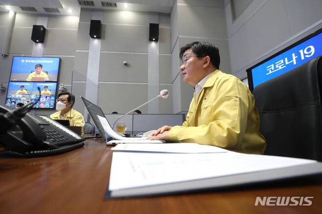 중대본 회의가 끝날때까지 긴장을 내려둘 수 없었다. ©뉴시스회의가 시작되자마자 중대본 모두발언과 관련한 보도가 쏟아지기 시작했다. 약간의 시차를 두고 중계되는 TV 모니터 앞을 지켰다. 간혹, 발음이 꼬이는 부분을 직접 보게 되면 안타까운 한숨이 나도 모르게 새어 나왔다. 다 내 탓만 같았다.