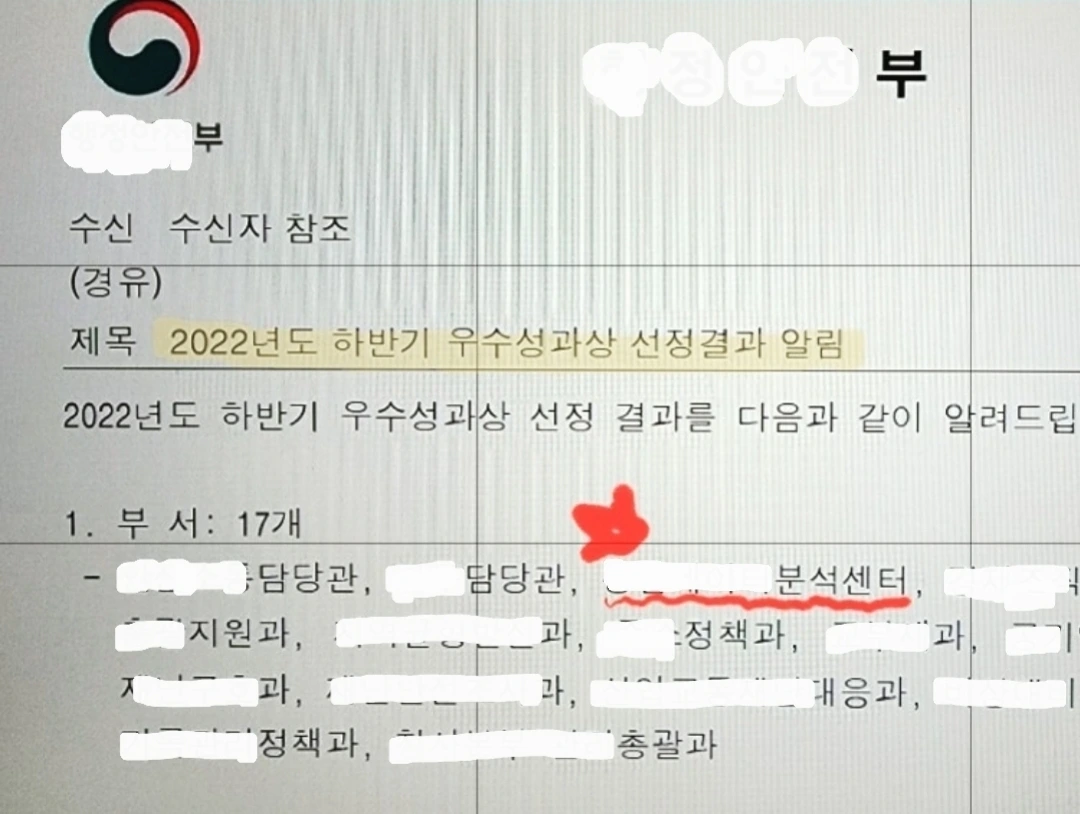 어쨌거나, 어제 공람이 걸려온 공문을 통해 우리 과가 우수부서로 선정되었다는 것을 확인했다. 전체 200여 개 부서 중 우수부서 17개 부서 안에 포함됐다. 기쁜 일이기도 하지만 그보다는 다행이라는 생각이 더 컸다.