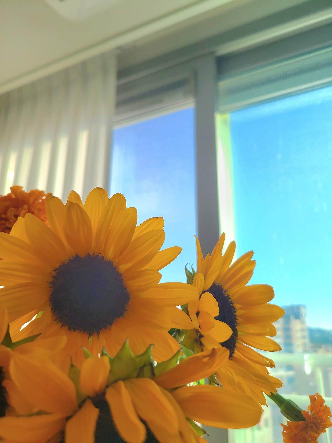 잔소리를 얻어 먹고 나서 며칠 후 사들고 왔던 샛노란 해바라기 한다발이 식탁 위 유리병에 꽂혀 따뜻한 아침햇살을 받고 있다.