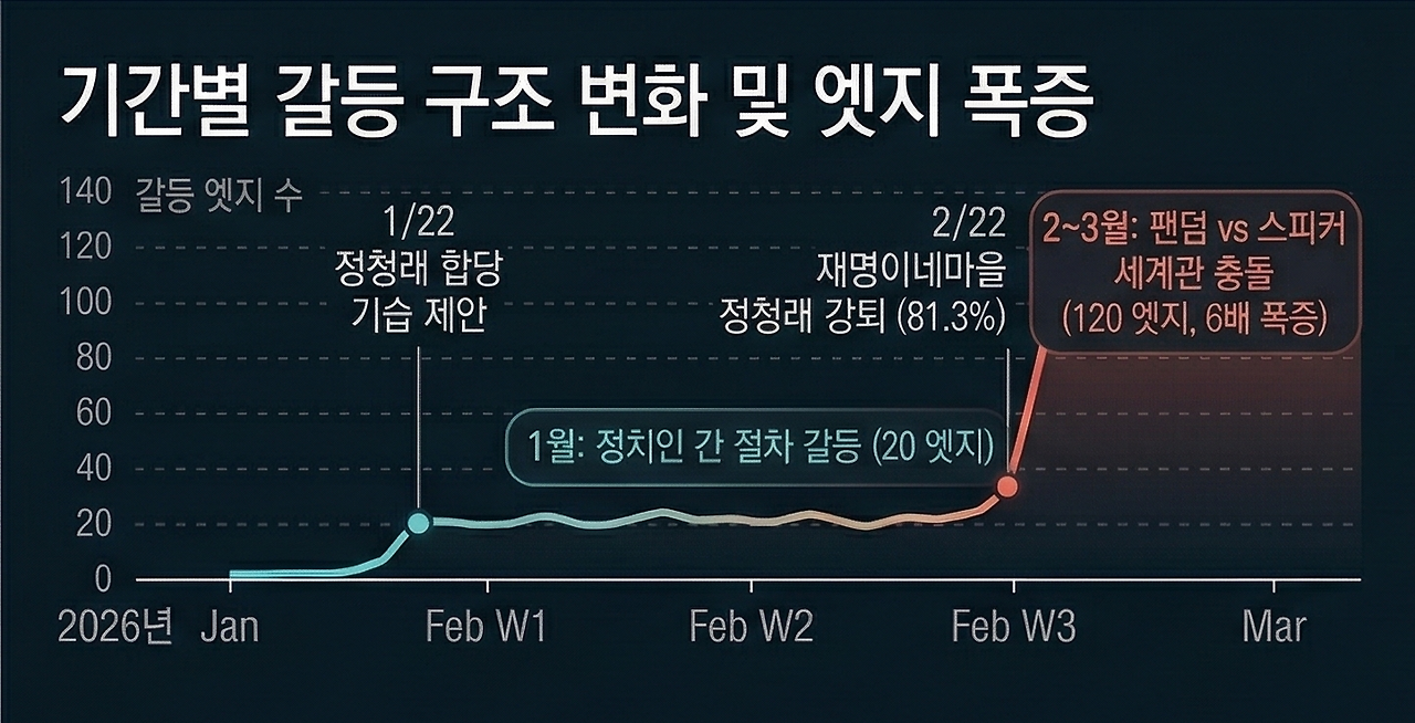 동적 정치 네트워크 그래프 분석 도구를 활용해 2026년 1월과 2~3월의 뉴스 기사를 비교 분석했다. 뉴스 텍스트에서 인물과 집단이 같은 맥락에서 함께 등장하는 횟수를 자동으로 카운팅하고, 주변 맥락의 갈등/연대 키워드를 감지하는 방식이다. 결과는 예상보다 극적이었다.