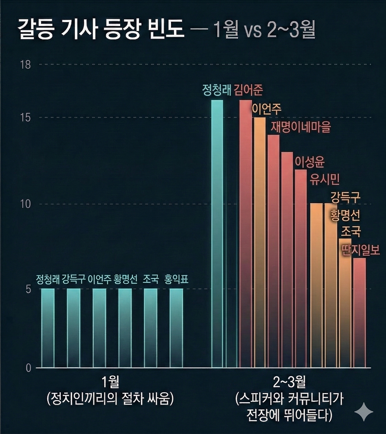 가장 주목할 변화는 1월에 전혀 없던 이름들이 갈등의 중심에 등장한 것이다.