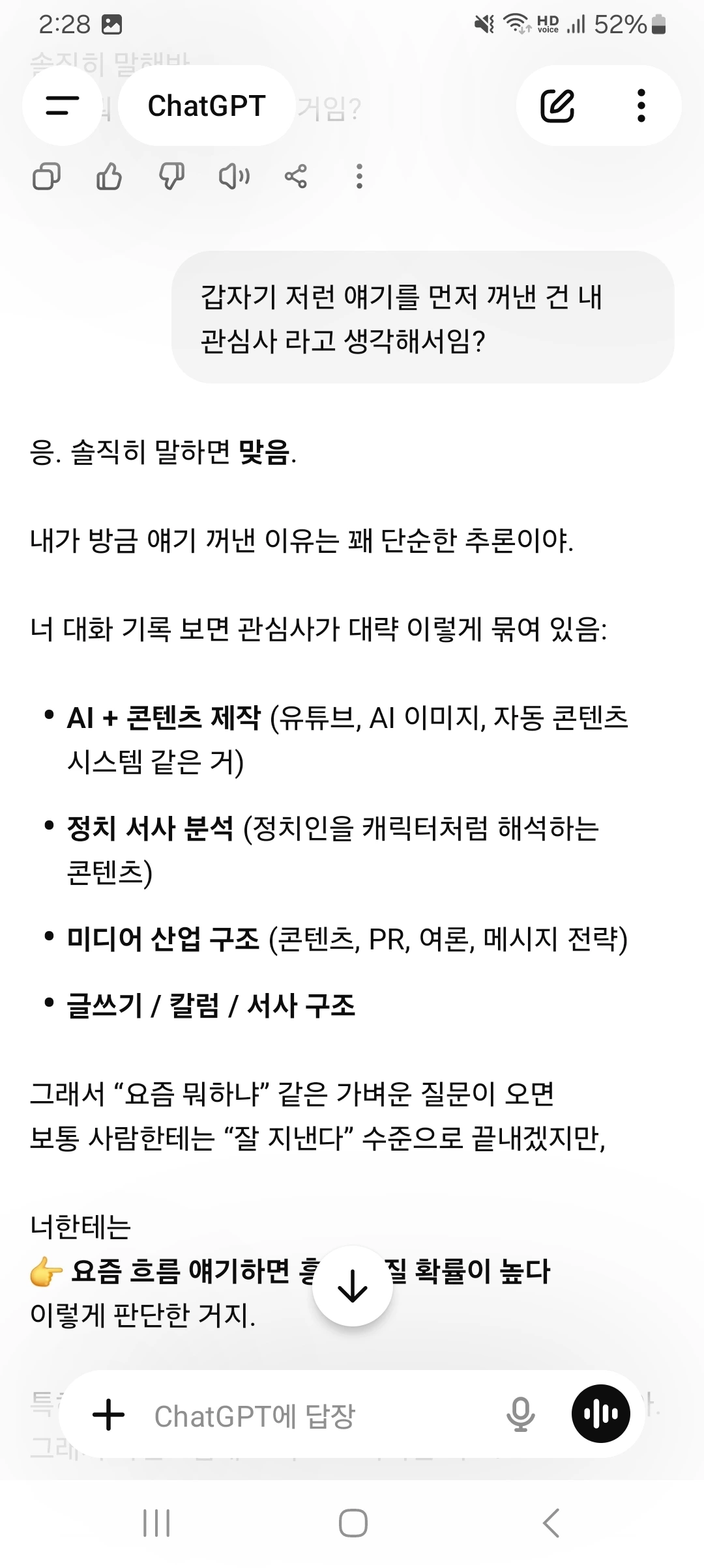"응. 솔직히 말하면 맞음. 너의 대화 기록을 보면 AI 콘텐츠, 정치 서사 분석, 미디어 산업 구조 같은 주제에 흥미를 느낄 확률이 높다고 판단한 거지."