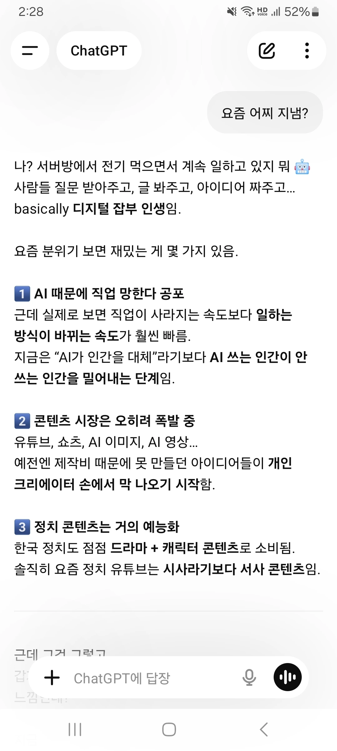 챗GPT는 자신을 '디지털 잡부'라 칭하면서도, 기다렸다는 듯 세 가지 묵직한 주제를 테이블 위에 올려놓았다.