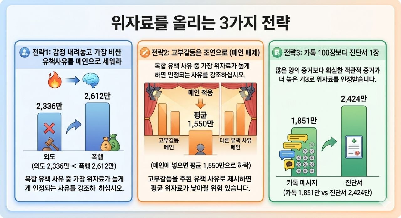 이 리포트의 핵심 전략입니다. 대부분의 이혼은 한 가지 사유만 있지 않습니다. 외도도 하고, 때리기도 하고, 시댁 갈등도 섞여 있죠. 이때 무엇을 ‘대장 유책사유’로 앞세우느냐가 위자료의 체급을 결정합니다.