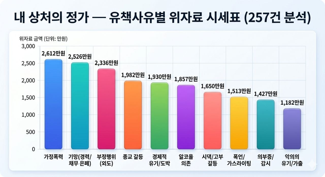 배우자가 외도도 하고 폭행도 했다면, 감정적으로는 외도에 더 분노할 수 있습니다. 하지만 데이터는 말합니다 — 부정행위(2,336만원)보다 가정폭력(2,612만원)이 300만원 더 비쌉니다. 법원은 '마음의 변심'보다 '신체의 훼손'을 더 비싼 상처로 봅니다.