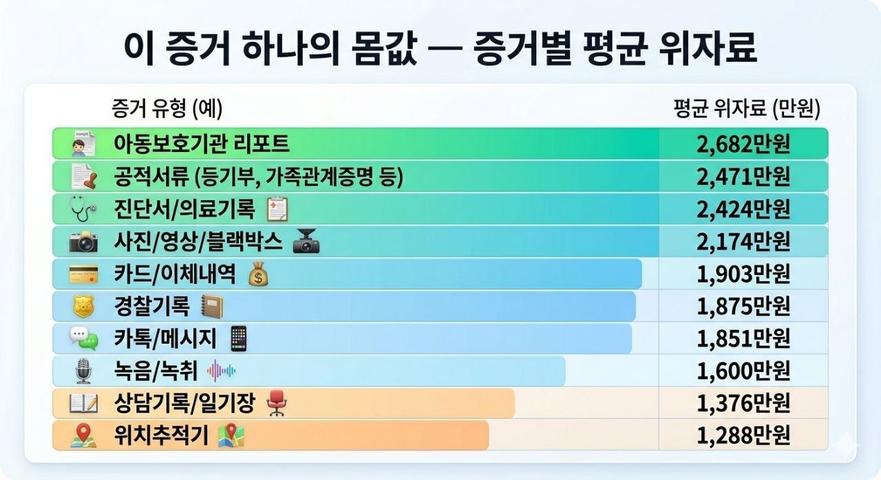 증거를 많이 모은다고 위자료가 올라가지 않습니다. 데이터는 ‘증거의 양보다 질’이라고 말합니다. 어떤 증거가 판결문의 숫자를 바꾸는 압도적인 힘을 가졌는지 확인하십시오.