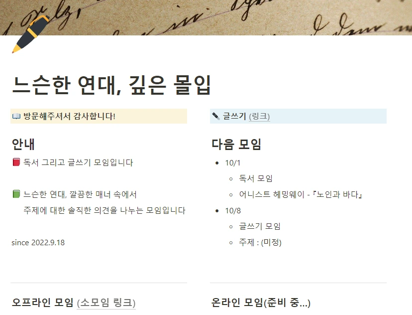 다른 모임과 차별화를 하기 위해 생각해둔 아이디어가 몇 가지 있었다. 온라인으로 이루어지는 것들이 많았기 때문에 반드시 웹사이트가 필요했다. 그래서 가장 쉽게 웹사이트를 만들 수 있는 Notion으로 다음 사이트를 구현했다. (링크)