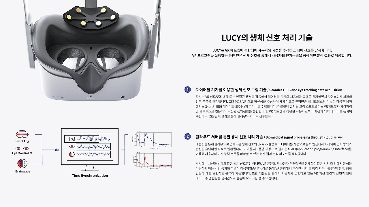 룩시드랩스는 가상현실 기기와 뇌파, 안구 운동 정보를 활용해 인지기능 상태를 측정하여 인지 저하가 의심되었을 때 조속한 관리로 이어질 수 있도록 돕기 위한 서비스 LUCY를 개발하고 있습니다. 언제 어디서든 LUCY를 통해 재미있는 VR 게임을 하면서 자신의 인지기능 상태를 확인할 수 있기 때문에 지속적으로 뇌 건강을 관리할 수 있습니다. 더불어 룩시드랩스의 우수한 생체신호 분석력으로 기억력이나 주의력 등 특정 인지기능을 사용하는 게임을 했을 때 보이는 뇌파나 안구 운동의 패턴들을 분석하여 과학적 근거를 기반으로 치매 발병 가능성을 감지할 수 있습니다. 이후 아티클에서는 치매 관련 바이오마커에 대해 소개해드릴 예정입니다. 디지털 도구를 활용해 수집한 치매 환자의 생리학적 정보와 행동 패턴이 임상적으로 어떤 근거 자료가 될 수 있는지 알아보도록 하겠습니다. 그 이후에 룩시드랩스의 뇌파, 안구 운동 정보 분석 기술이 어떻게 치매 조기 진단 도구로써 활용되는지 설명드리겠습니다.