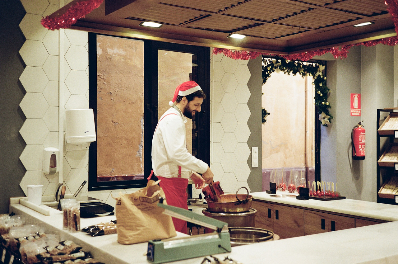 산타복장으로 눈길을 끄는 데 성공하자 현란한 손길로 땅콩을 달달하게 코팅하며