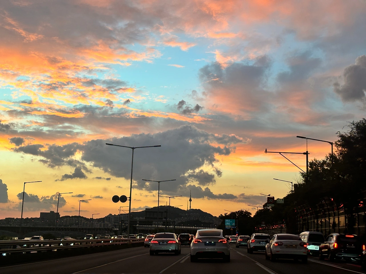 친구 집에서 국악 연습실을 가는 길 강변 북로를 탔고, 자연스럽게 해가 지는 서쪽하늘을 마주 보게 되었다. 운전을 하며 좋은 점 중 하나는 전면 유리 가득 풍경을 볼 수 있다는 것이다. 그 유리는 영화나 드라마를 보여주는 스크린이 되기도 하고 인상파 작가의 유화나 수채화 그림 액자가 되기도 한다. 정지 신호에 대기하다 횡단보도를 건너는 아이와 아이 손을 잡은 엄마, 씽씽이를 타고 가는 아이와 그 보다 더 빨리 지나가는 자전거, 시장바구니를 끌고 가는 할머니와 가방을 메고 핸드폰을 힐끔거리며 발걸음을 재촉하는 학생의 모습을 보고 있으면 어디선가 본 것 같은 드라마나 영화의 한 장면 같다는 생각이 든다. 양쪽으로 늘어선 가로수가 차가 향하는 길을 조금씩 열어주며 나를 내려다보는 기분은 인도를 걸을 때는 느낄 수 없었던 것이었다. 파란 하늘에 하얀 구름이 뭉게뭉게 피어오르며 강아지 모양, 하트모양 같은 것들이 휙휙 지나가면 방금 있었던 일들을 잊어버리고 한껏 기분이 몽글몽글해진다. 그리고 오늘 강변북로에서는 주황색과 흐릿한 노랑, 연녹색과 하늘색 그러데이션에 불타는 태양을 닮아버린 듯 황금 노란색과 주황색, 산호 분홍색의 구름이 장관을 이루고 있었다. 게다가 그 구름은 태양에 맞서고 있어 이글거리는 노란색 뒤로는 회색 그림자가 생겼고 하늘색과 대비되어 강렬한 존재감을 드러내고 있었다.