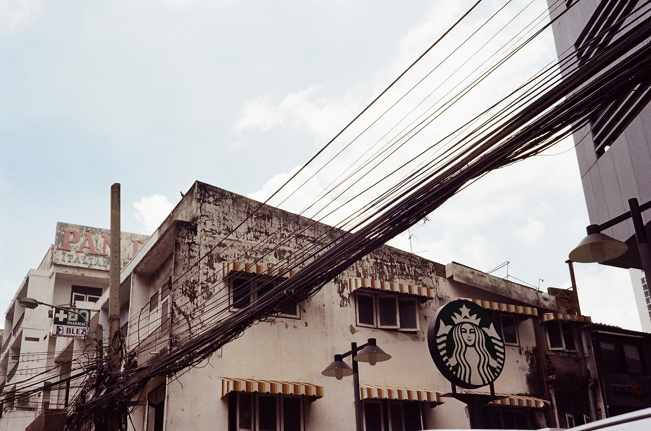 복잡하게 얽혀 두꺼워진 전깃줄 뭉텅이