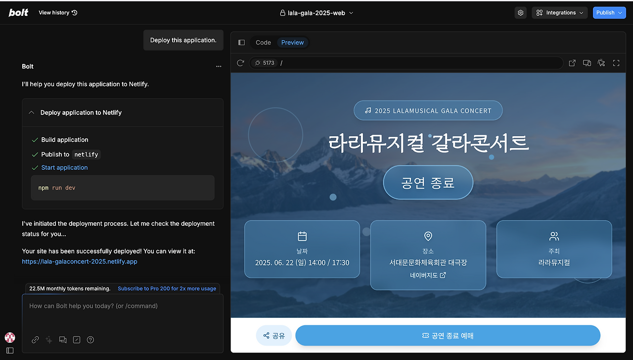 저와 Bolt.new와의 인연은, 6월에 직장인 뮤지컬 동아리에서 열렸던 '갈라콘서트 공연 예매사이트'에서 시작되었는데요. 당시에는 피그마.ai 기능이 출시 되기 전이었고, Bolt.new + Supabase + Netlify 조합으로 코딩하고 사이트를 출시했습니다.