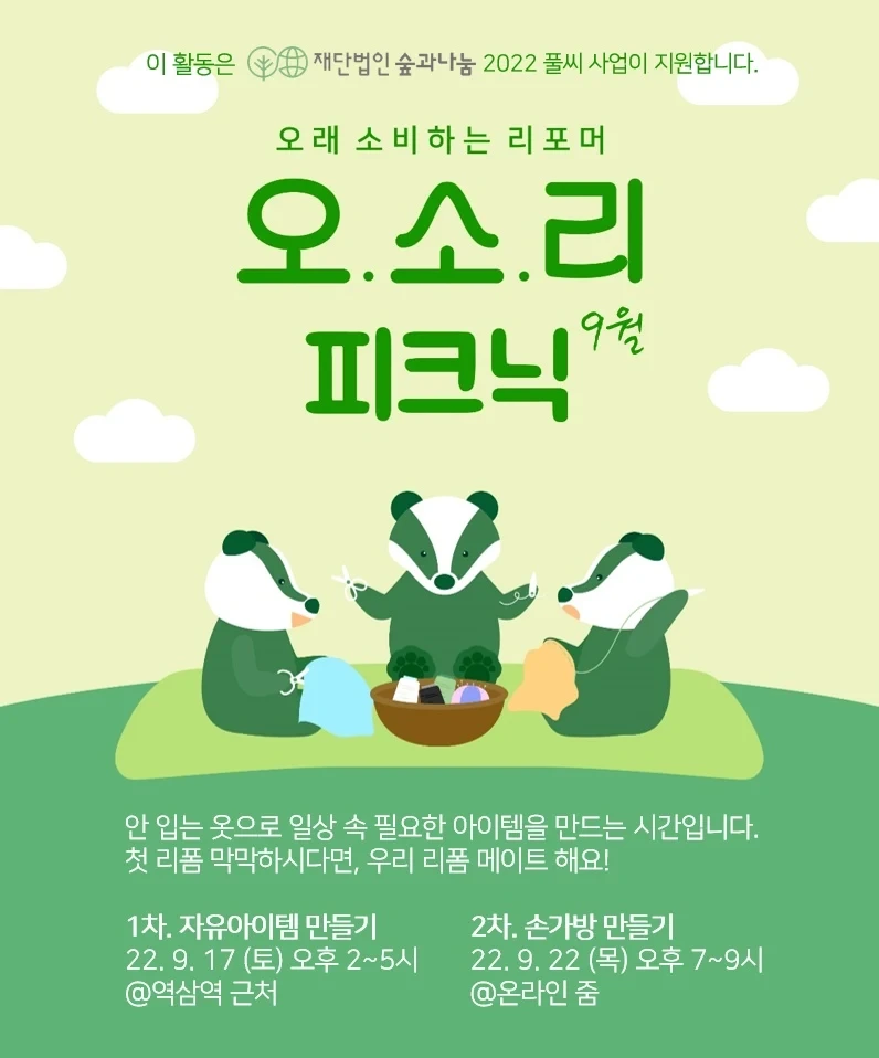 오소리 피크닉 <9월> 모집 안녕하세요. 대빵 오소리�입니다. 오소리는 옷을 더 오래 소비하기 위해 '입는 프레임'에서 벗어나 다양한 아이템을 만드는 '유니크한 원단'으로 활용하기 위한 모임입니다. 뜻밖에도 저는 바