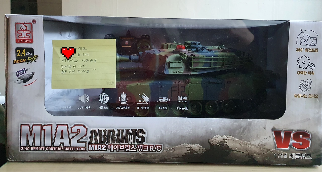 그런데 이른 아침, 문을 열자 큰 박스가 문 앞에 놓여있었다. 놀랍게도 아이들이 좋아할 만한 무선 조종기로 조종이 가능한 탱크였다.