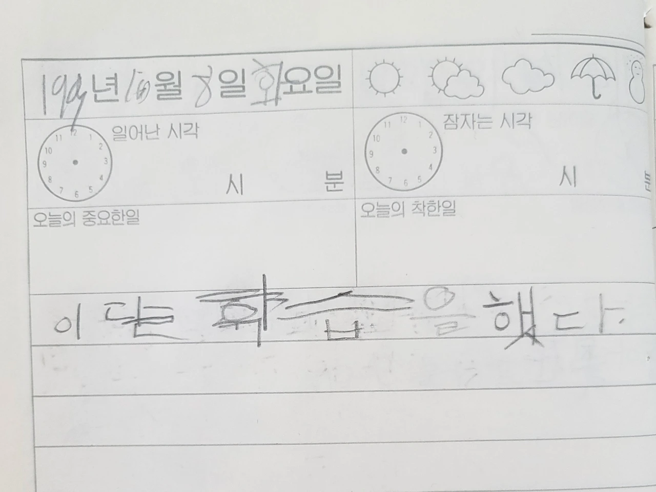 그때는 글짓기가 어찌나 싫던지 글짓기 숙제만 있으면 진저리를 쳤던 것 같다. 말로는 그렇게 수다스러우면서 글로 표현한다는 것은 왜 그렇게 부담스러웠을까. 지금 생각하면 왜 그렇게까지 글을 쓴다는 게 싫었을까 싶은데 그때는 일기를 쓰는 법 조차 제대로 알지 못해서 그랬던 것 같기도 하다. 어릴 때 일기를 보다 보면 글쓰기 싫은 마음이 뚝뚝 떨어진다. 글씨를 엿가락마냥 길~게 늘어뜨려 한 줄을 겨우 채운 날도 있다.