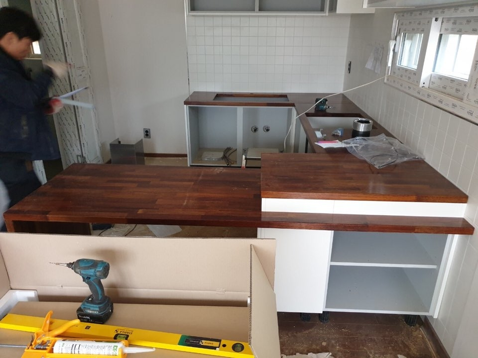 싱크대는 과거 디자인 회사에서 잠깐 일했던 경험을 되살려 정성껏 도면을 그려서 넘겼는데, 다행스럽게도 도면과 동일하게 결과물이 나왔다. 원목을 좋아하는 내가 원했던 단단한 멀바우 상판이 올라간 멋진 싱크대였다. 물론 싱크대의 추가 비용도 만만치 않았지만, 후회 없는 결정이었다. 아쉽게도 요리를 많이 하지 않아서 싱크대 내부는 거의 계획을 하지 않았는데, 서랍이나 레일, 거치대 등이 전혀 없는 문만 달리 싱크대가 되어 버렸다. 불편한대로 사용하고 있긴 하지만, 싱크대 안까지 조금 더 신경 썼더라면 좋았을걸 하는 생각을 자주 한다.