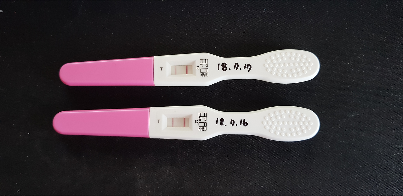 그리고 18년 7월 16일, 임신 준비를 시작한 지 약 5개월 만에 나는 화장실에 앉아 희미한 임테기의 두 줄을 만나게 되었다. 정확한 배란일까지 체크하며 신경을 쓴 지는 두 달도 채 되지 않았을 시점이었다. 처음 떴을 때는 너무 희미해서, 사실 이거 맞나 싶은 마음이 들었지만 약 5분이 지난 후 그 줄이 점점 선명해지기 시작하자 갑자기 온몸에 소름이 돋았다. 이거 진짜, 진짜로? 임테기를 든 손이 가늘게 떨리기까지 했다.
