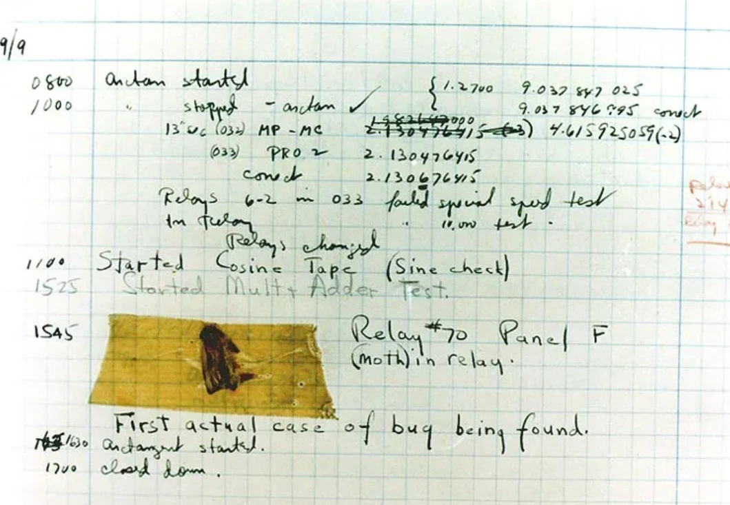 1947년, 미 해군이 사용하던 Mark II 컴퓨터의 기판에 붙은 나방 한 마리가 합선을 일으킵니다. 그리고 그날의 기술자는 이 사건을 '버그가 있었다'라고 기록합니다. 세계 최초로 공식적으로 등록된 버그의 모습입니다.
