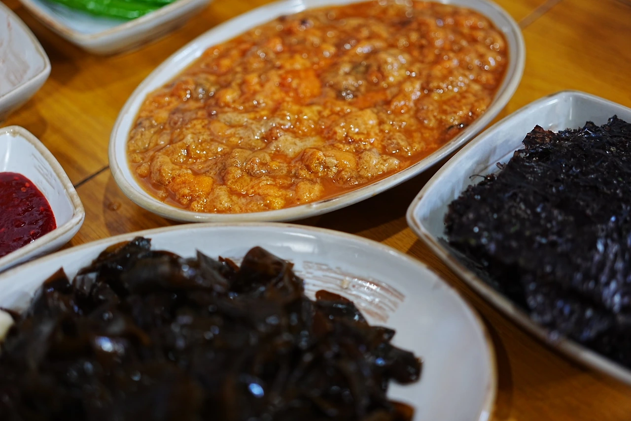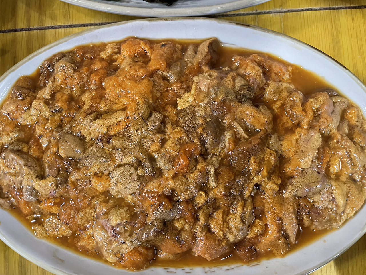 우리가 주문한 요리는 꼼장어 수육과 성게알이었다. 흔히들 꼼장어 구이와 꼼장어 볶음은 많이들 먹어봤을 거라 생각하는데 꼼장어 수육은 나 역시 제주 그 식당에서 처음 먹어 봤다. 육고기 수육은 흔하게 먹었지만 꼼장어 수육이라.. 사실 비주얼도 그렇고 약간은 비릴. 것 같은 거부감과 걱정이 살짝 있긴 했지만 한 입 먹었을 때 그 맛이란 걱정은커녕 감탄이 절로 나왔다. 물론사람마다 호불호는 있겠지만 말이다. 수육이 식지 않게 찜기에서 계속 약불로 데우면서 먹을 수 있는데 꼼장어 수육 밑에 부추가 가득 깔려있고 수육 사이사이 생강채와 마늘이 함께 어우러져 있다. 그 향이 꼼장어 수육과 잘 어우러져 더욱 고급진 맛을 내는 듯했다. 꼼장어 수육과 부추와 생강채와 마늘을 함께 싸서 특제 소스에 찍어 먹는 맛이란 주변에서 흔하게 먹을 수 있는 음식이 아니라서 그런지 더욱 맛있게 느껴졌다. 함께 간 지인들의 감탄사 연발이 내 어깨를 더욱 으쓱하게 만들었다.