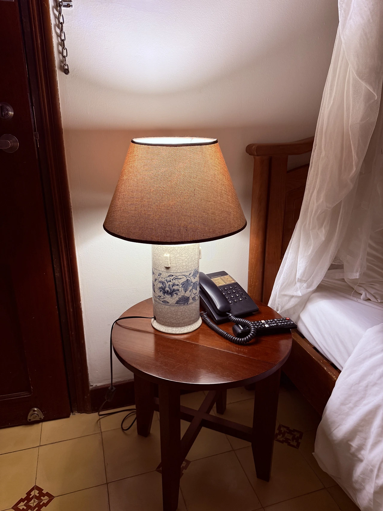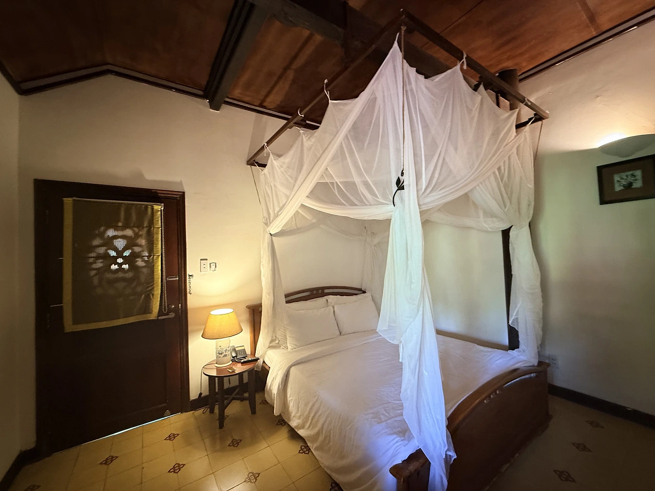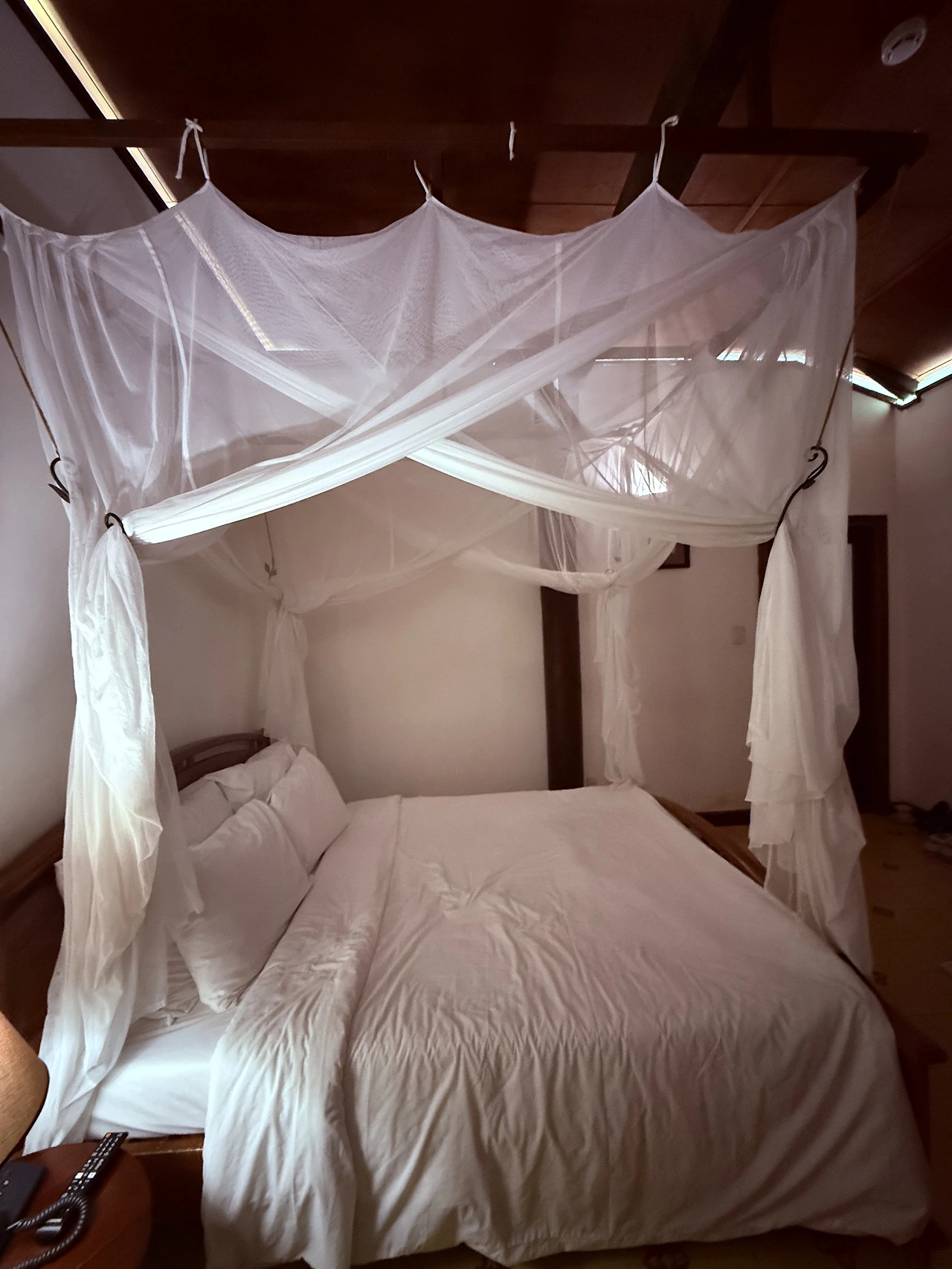 침대 위엔 얇은 흰색 모기장이 달려 있었다.