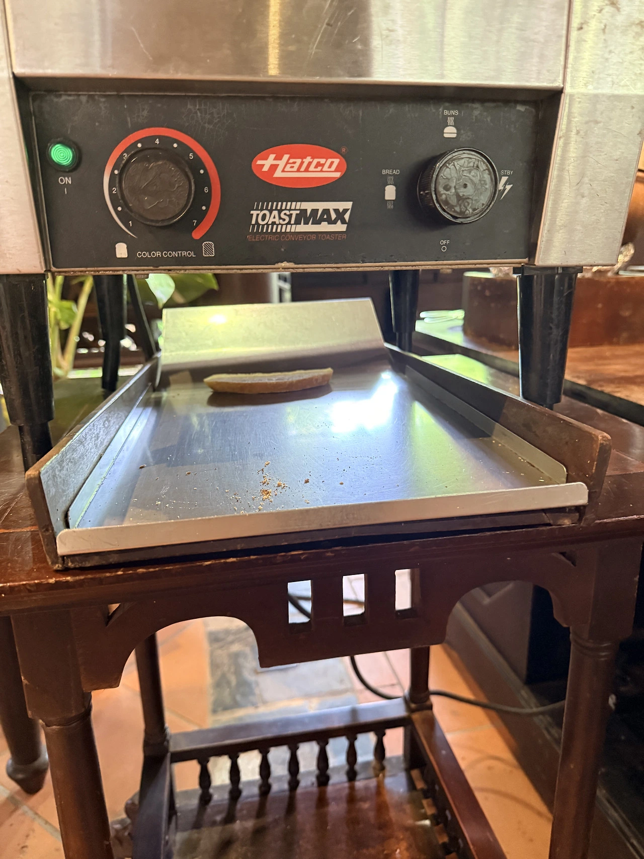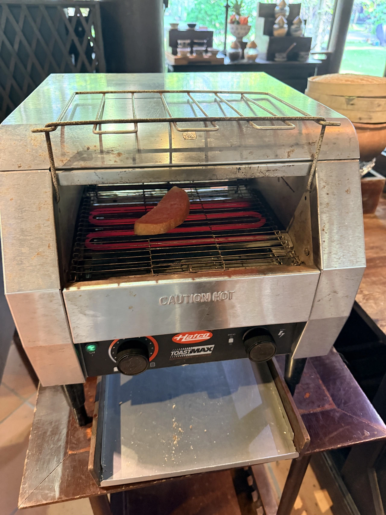 레트로한 스테인리스 토스터기가 천천히 움직였다.