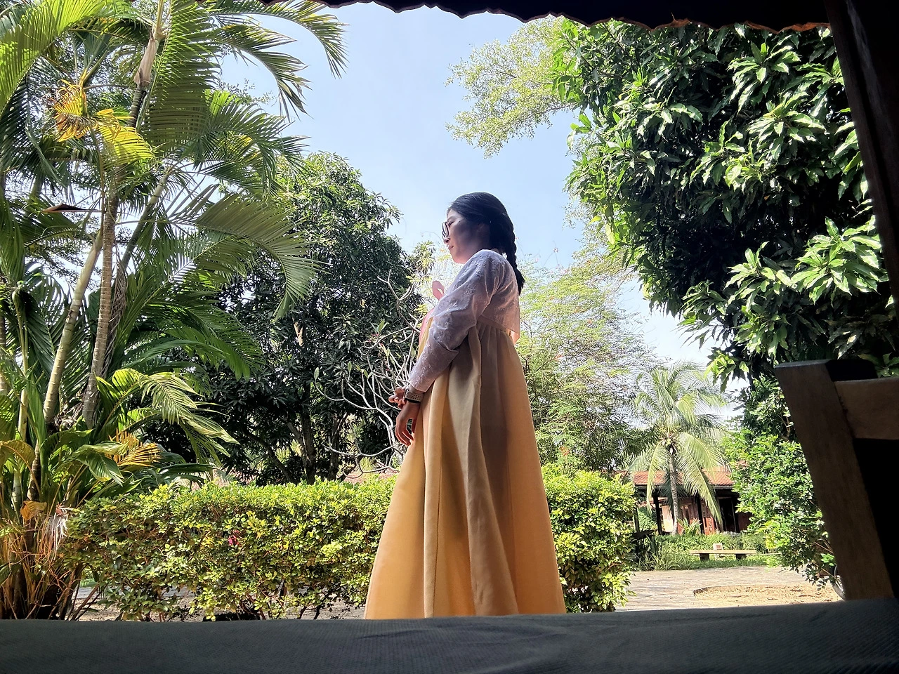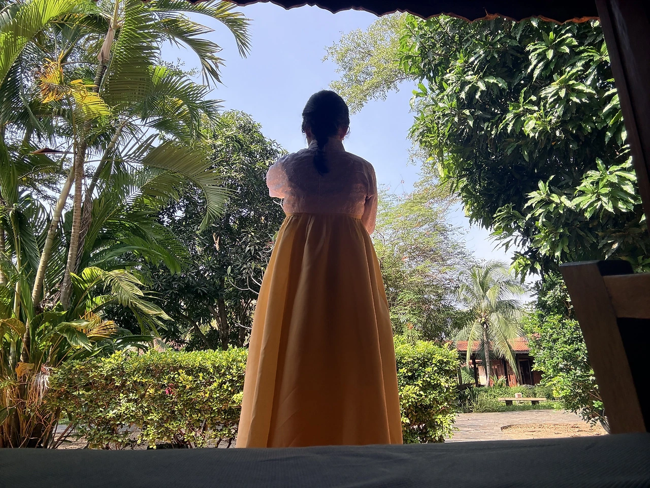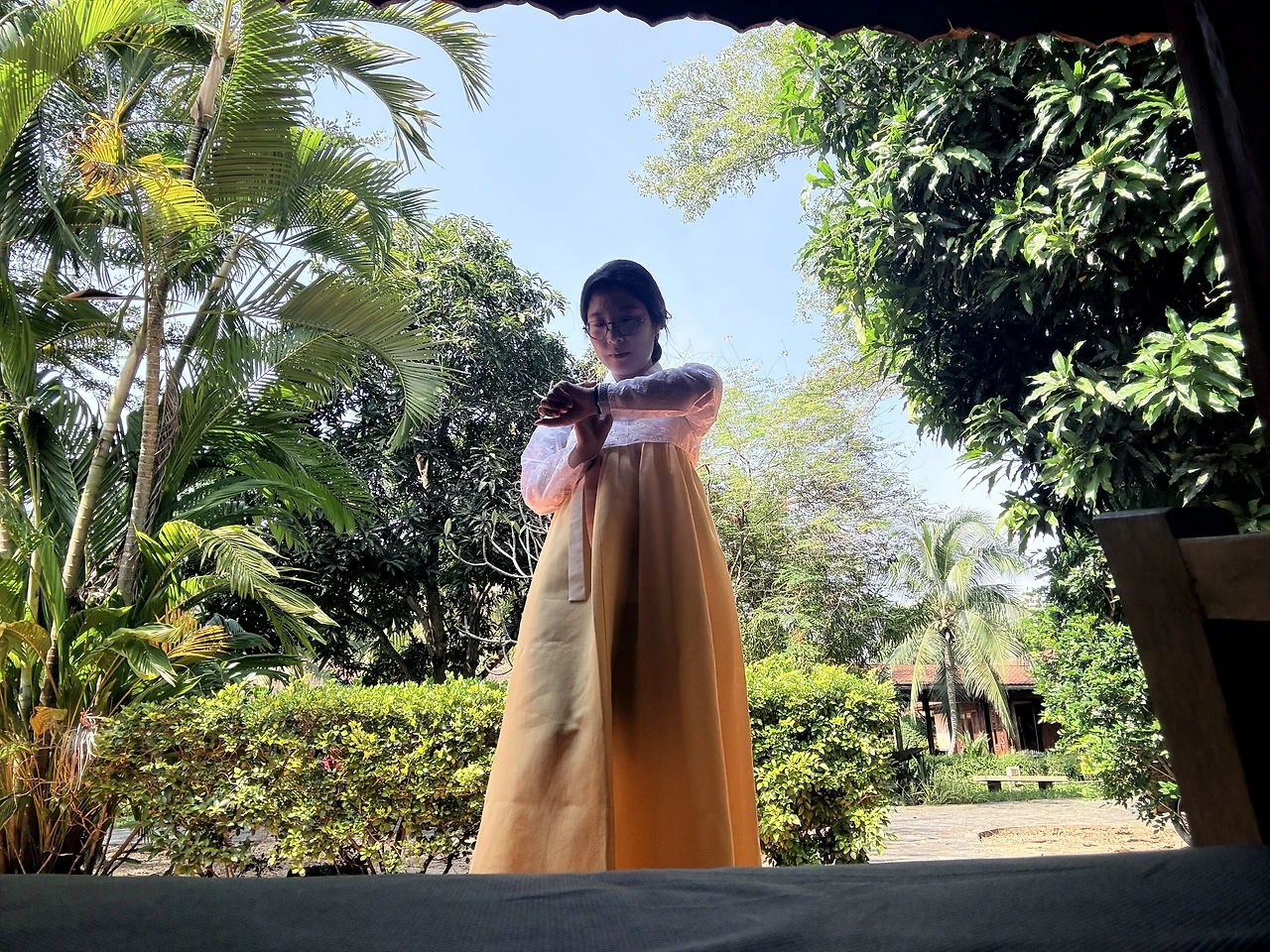 꽃들이 수놓아진 아이보리 저고리, 밝은 레몬색 치마.