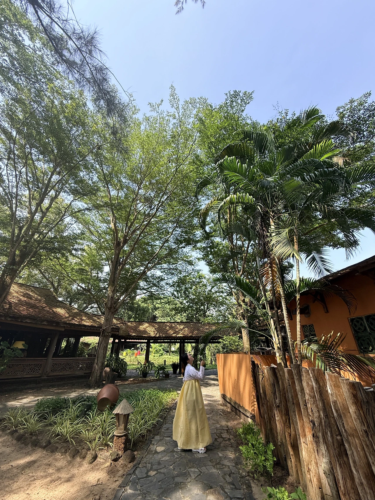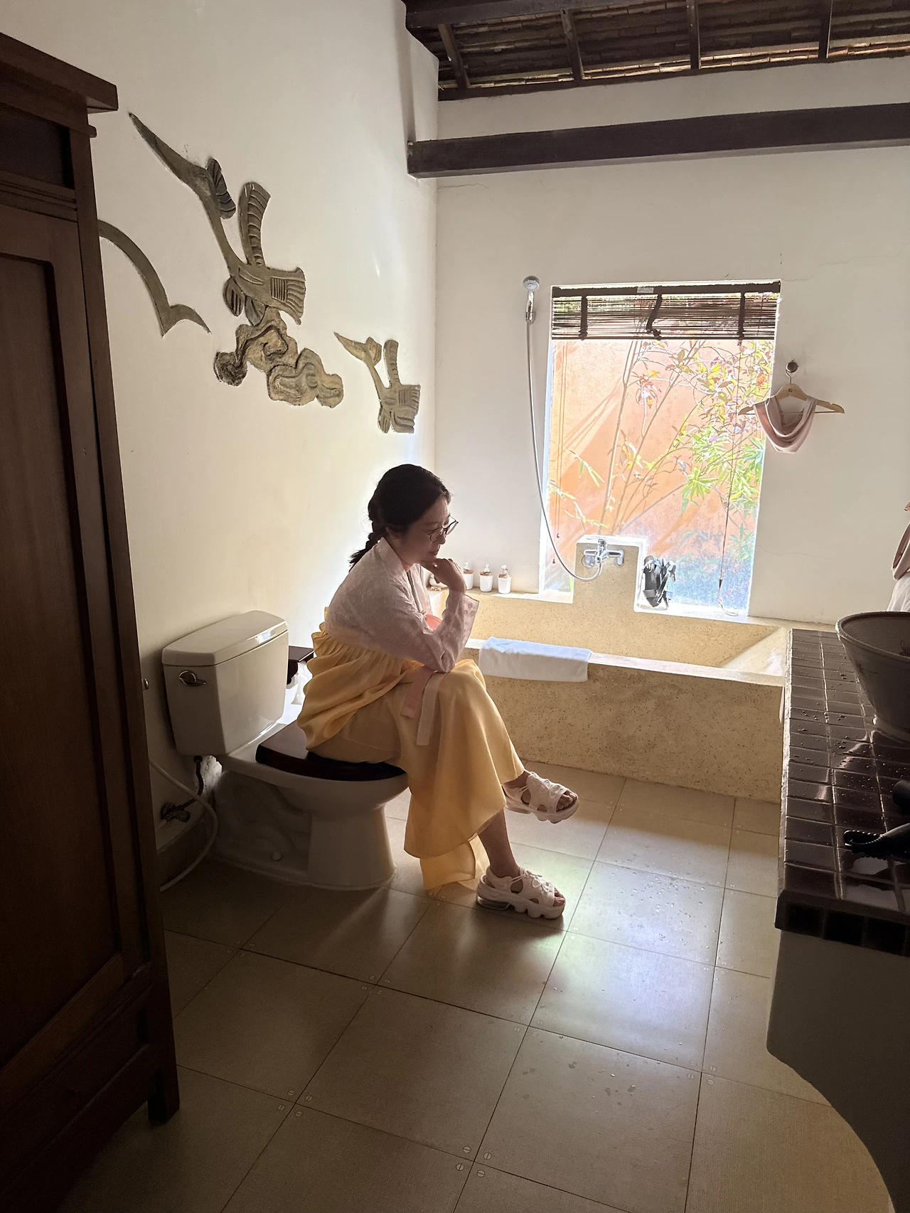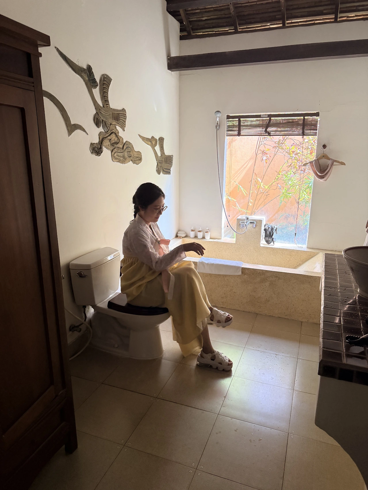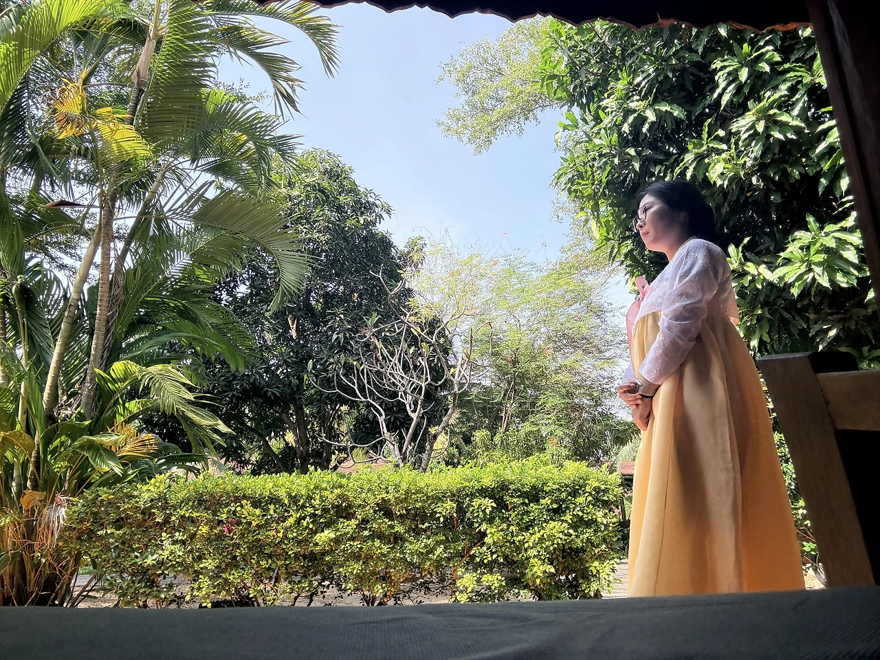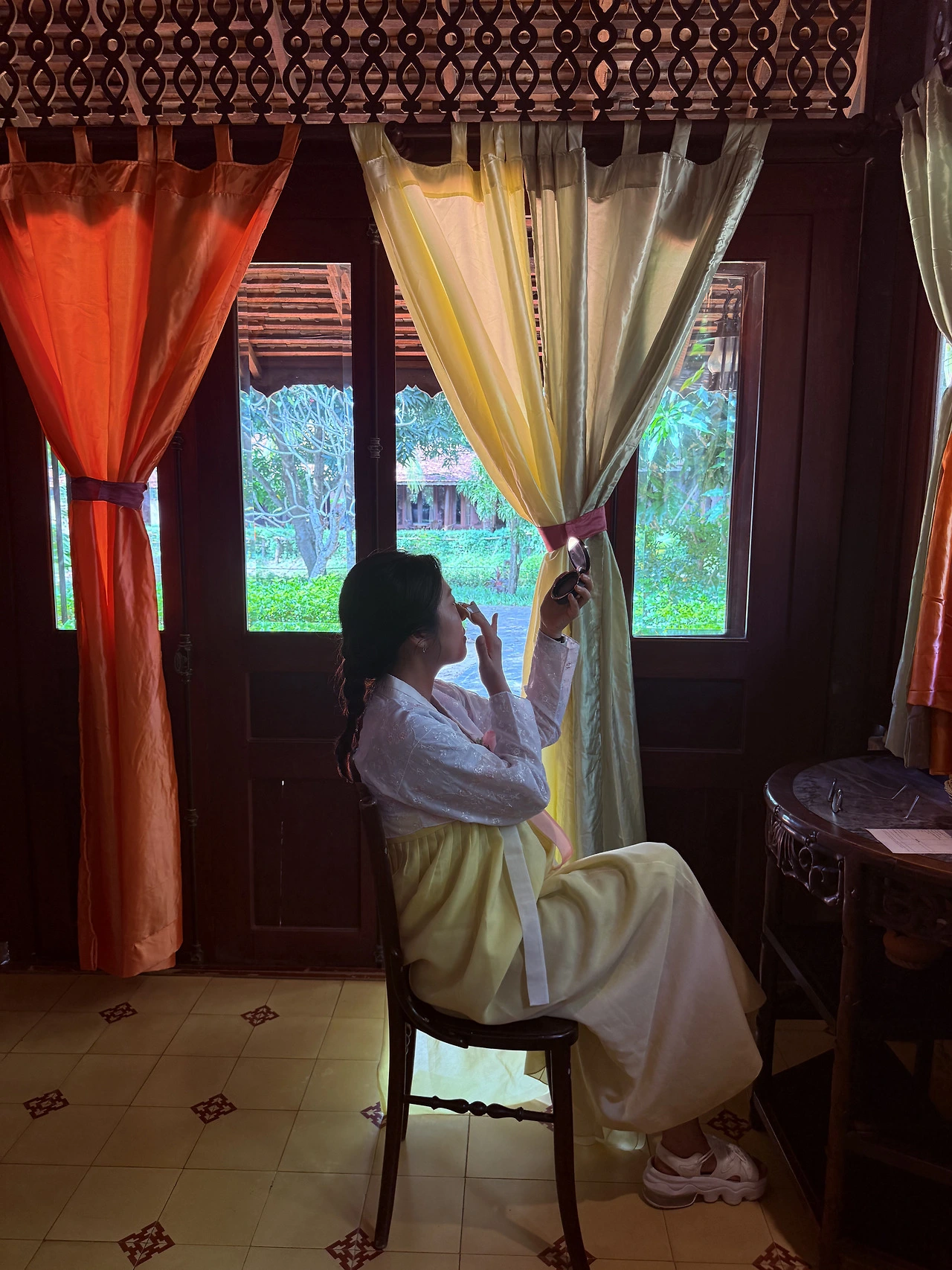 한복을 입고 연꽃 옆에 앉아 있는 나.