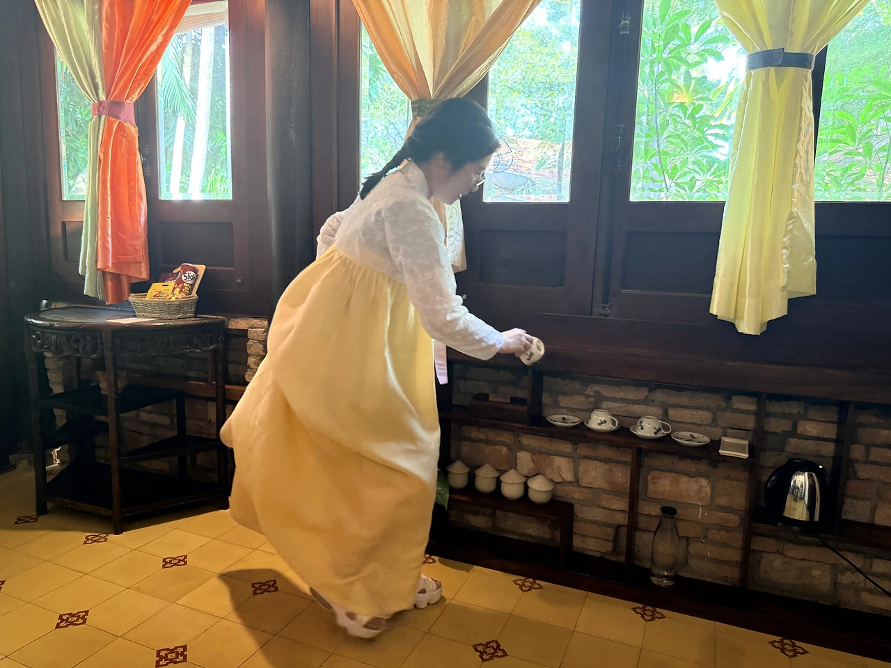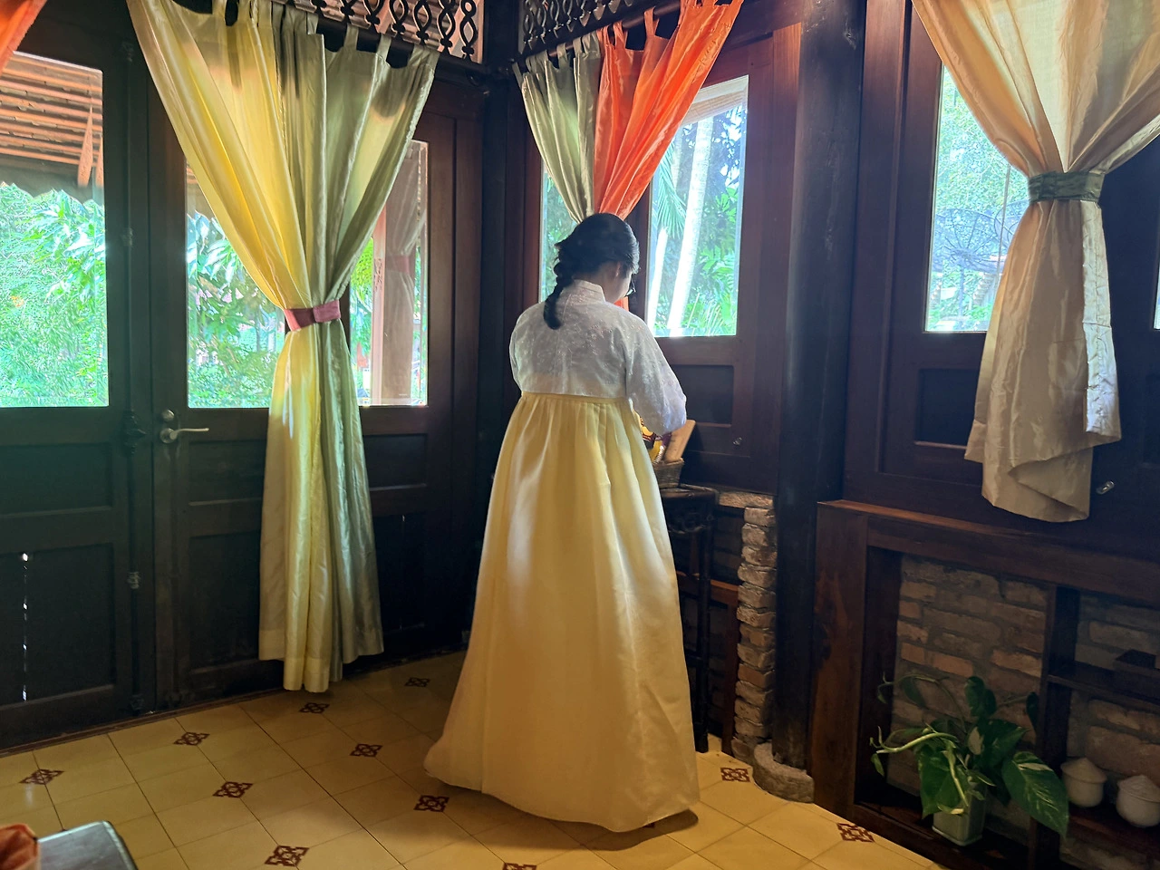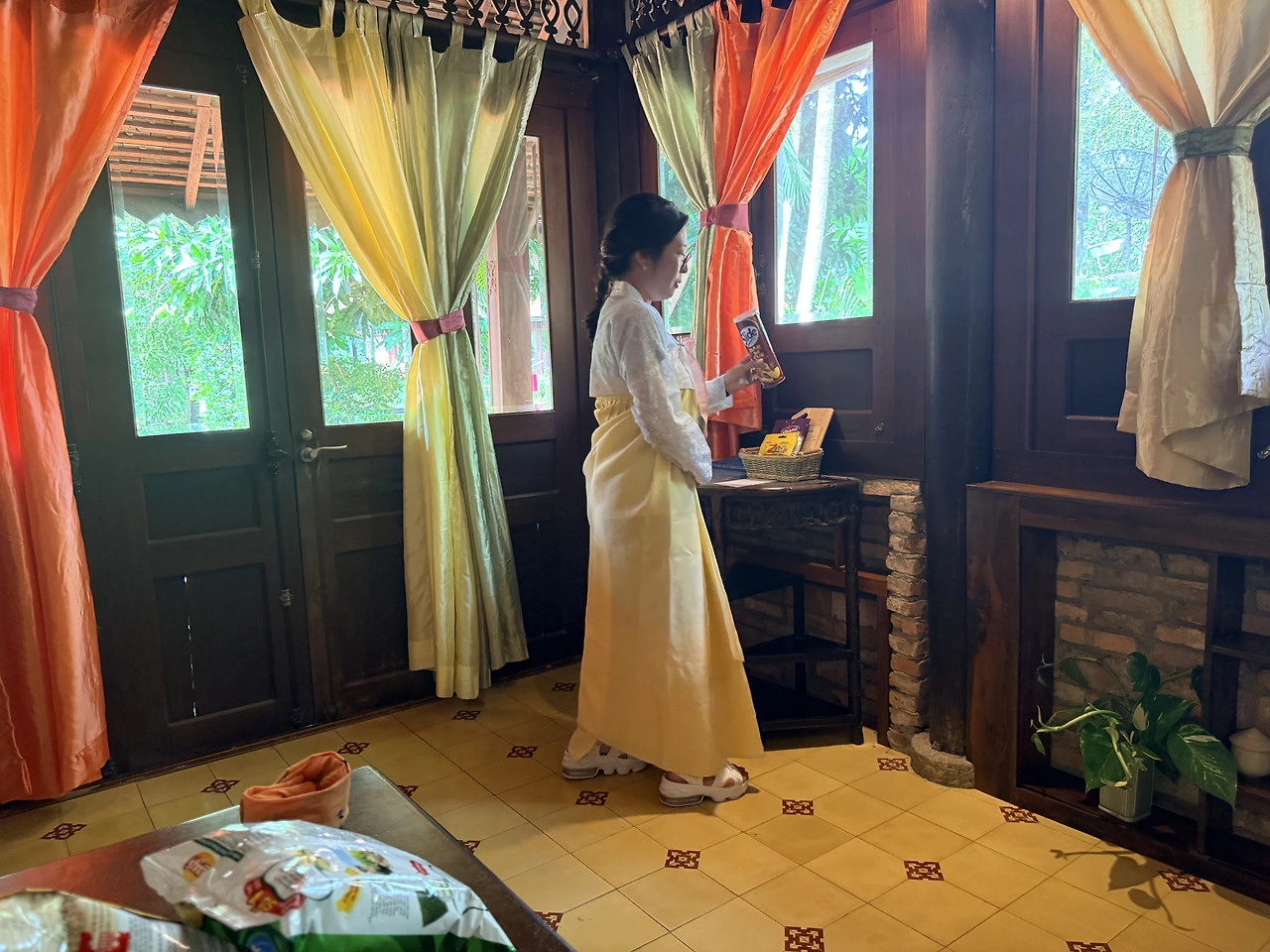 그리고 한복을 입은 한국 처녀의 라면 식사.