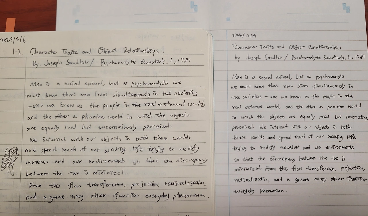 그즈음, Joseph Sandler의 1981년 논문 「Character Traits and Object Relationships」를 읽다가 논문의 끝자락에서 한 문장 앞에 멈춰 서게 되었다. 그 문장은 그날의 독서를 멈추게 했고, 나는 그 문장을 필사했다.