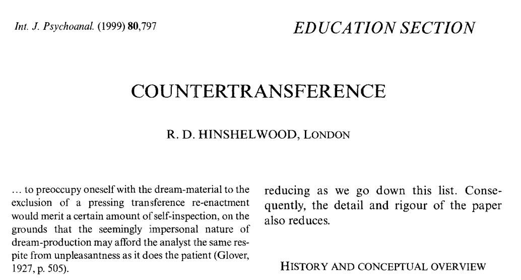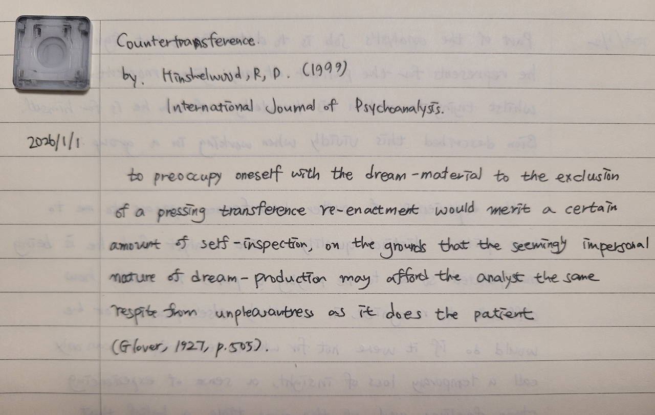 2026년 1월 1일, 새해 첫 정신분석 문헌으로 Hinshelwood의「Countertransference」를 읽었다. 이 글은 1999년 International Journal of Psychoanalysis의 Eduction Section에 실린 논문으로, 역전이 개념의 역사적 전개와 이론적 함의를 영국 대상관계 이론의 맥락에서 정리하면서, 동시에 라캉까지 가볍지 않게 호출하고 있었다. 무엇보다 인상 깊었던 점은, 역전이를 분석 과정의 잡음이나 방해물로 취급하지 않고, 관계적 역동이 가장 농축되어 드러나는 지점으로 재위치 시킨다는 점이었다.