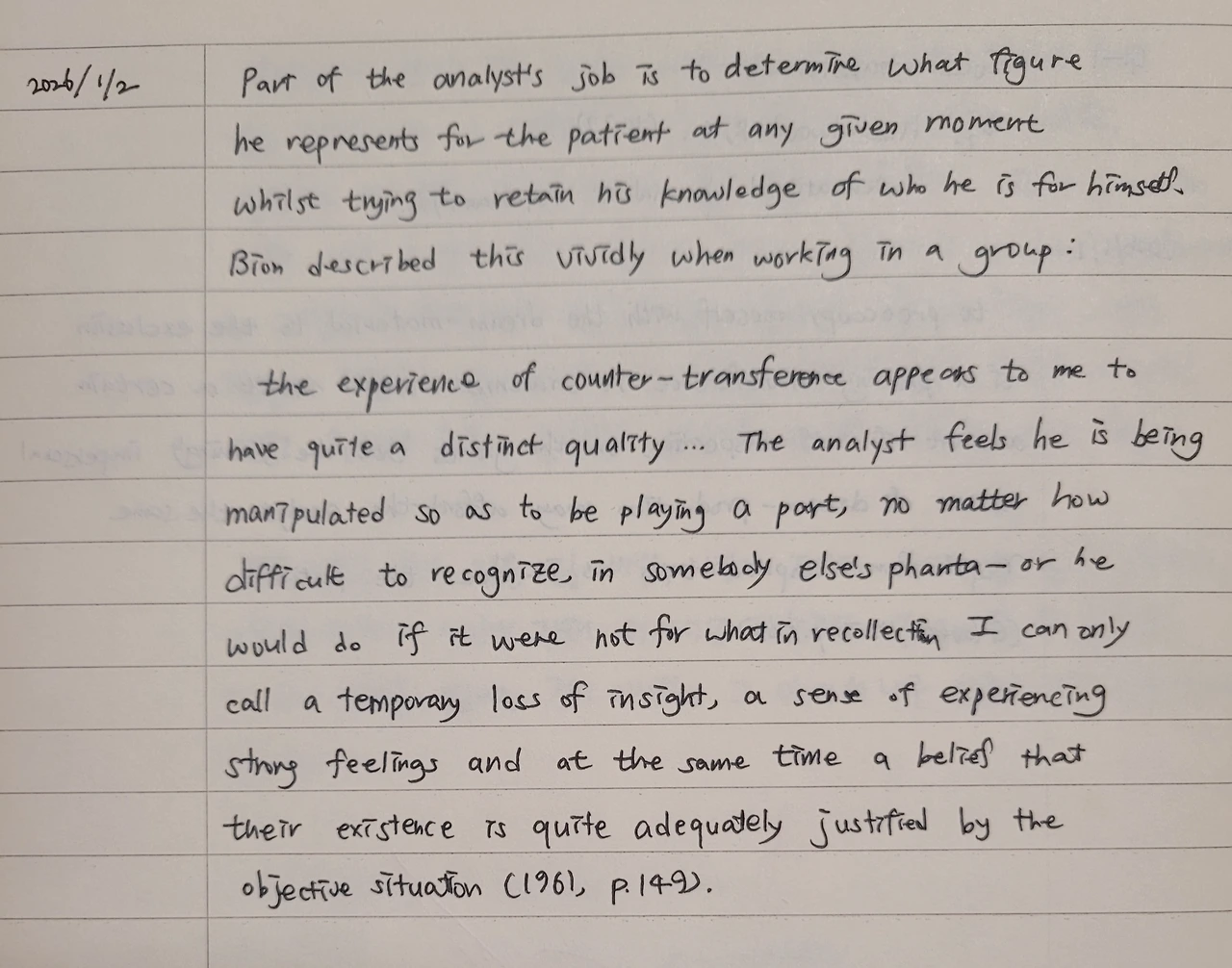교육 목적의 글답게 여러 분석가들의 문헌이 인용되어 있었고, 나는 1월 1일과 2일 이틀에 걸쳐 읽으며 두 개의 문단을 필사했다. 하나는 Glover의 문장이었고, 다른 하나는 Bion의 문장이었다. 두 인용은 서로 다른 문제의식을 다루고 있는 듯 보였지만, 읽을수록 같은 방향을 가리키고 있다는 느낌을 지울 수 없었다. 두 문장 모두 분석가가 불편함으로부터 잠시 벗어날 수 있는 지점을 정확히 짚어내고 있었기 때문이다.