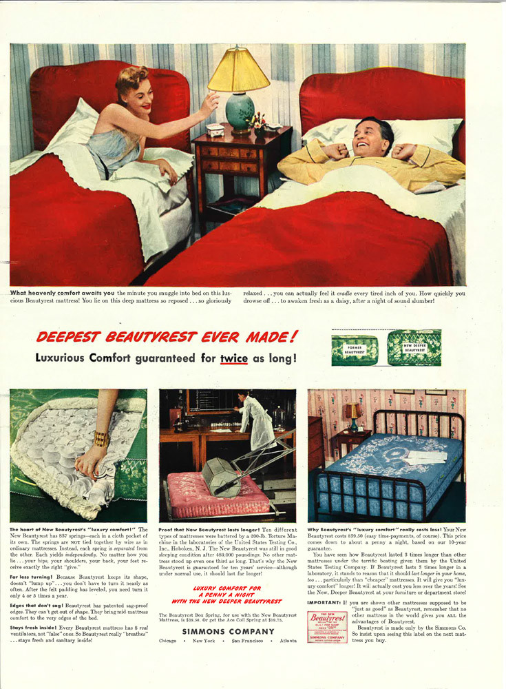 1900년대 초반의 시몬스 광고는 '뷰티레스트(Beautyrest)' 라는 '아름다운 휴식'을 콘셉트로 여성들의 아름다움을 위한 숙면의 중요성을 강조했습니다. 숙면을 취한 얼굴과 그렇지 못한 경우의 얼굴을 비교하는 사진을 광고에 넣는 등 재밌는 광고도 선보였다고 하네요:)