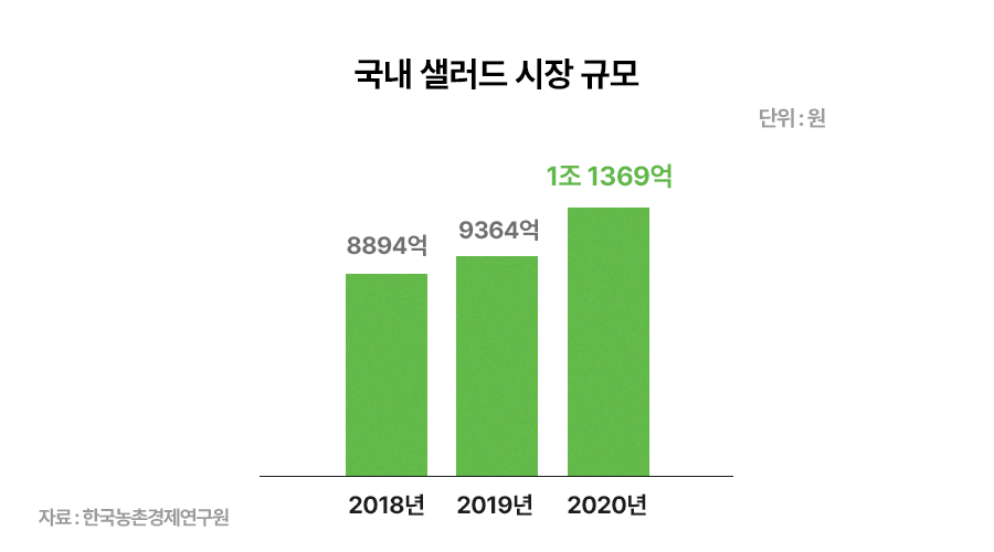 한국농촌경제연구원의 통계에 따르면 국내 샐러드 시장 규모는 2020년에 1조 원을 돌파한 것으로 나타났습니다. 2년 만에 무려 2,475억이 증가할 정도로 가파른 성장세를 보이고 있는데요. 앞으로도 샐러드 시장은 꾸준히 증가할 것으로 보입니다.