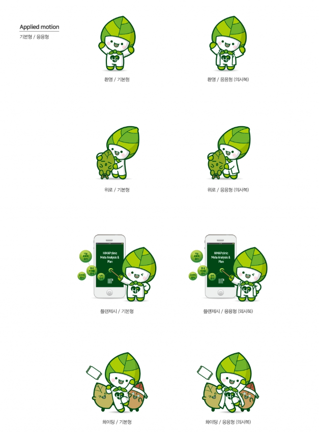 활기있는 삶을 유지하고, 아프지 않고 나이들어가며, 행복한 마음의 상태를 유지하는 절대 건강을 추구하는 하이맵의 취지와 역할을 건강과 치유, 힐링을 상징하며 하이맵의 CI와 아이덴티티가 연계되는 나뭇잎을 모티브로 캐릭터를 제작하였습니다.