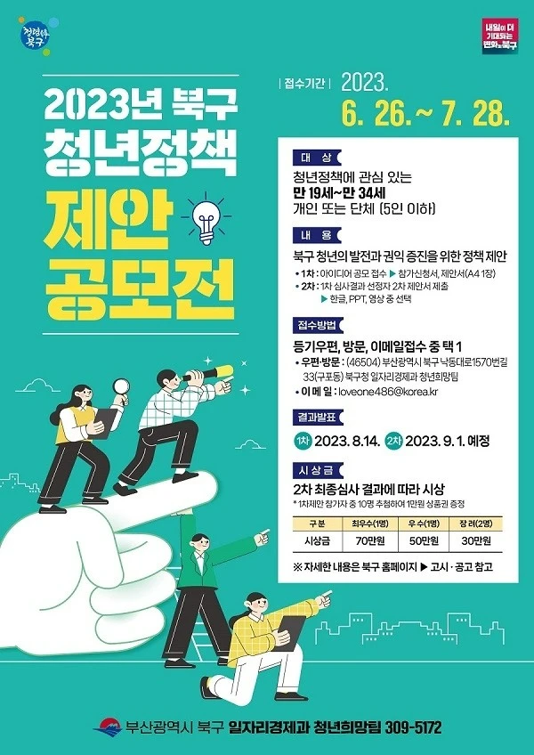 - 우편·방문: (우편번호 46504) 부산 북구 낙동대로1570번길 33(구포동) 북구청 일자리경제과 청년희망팀