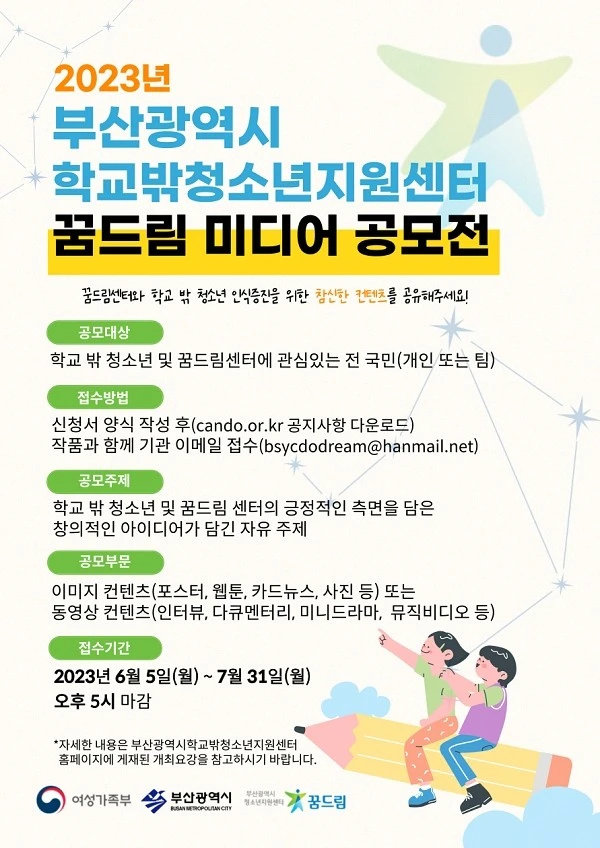 - 학교 밖 청소년 및 꿈드림 센터의 긍정적인 측면을 담은 창의적인 아이디어가 담긴 자유 주제