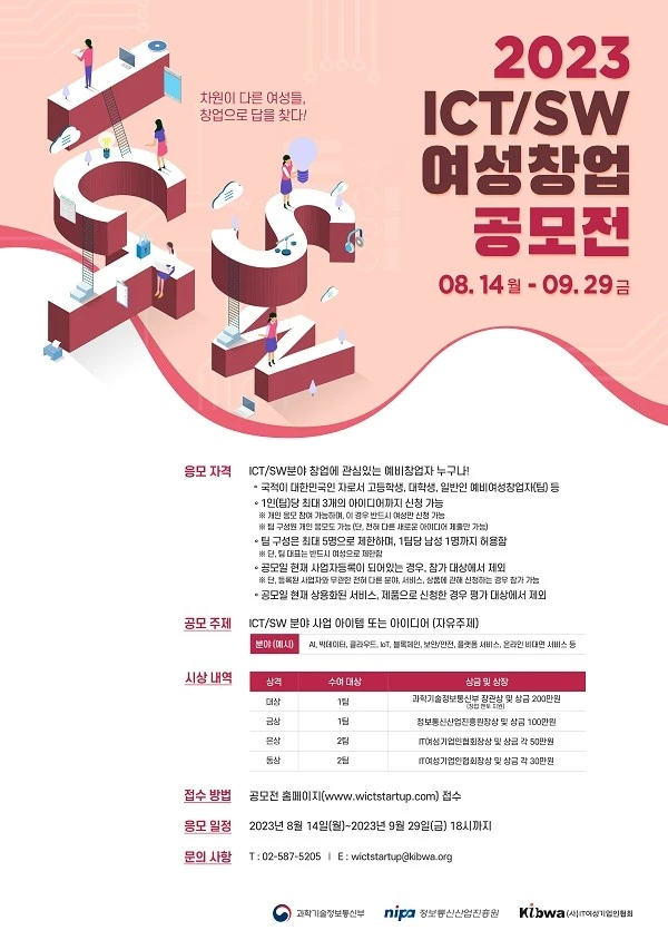 - ICT/SW 분야 창업을 희망하는 여성의 창업계획 및 창업 아이템 공모를 통해 최우수 아이디어를 선정하고, 최우수 아이디어 선정팀에 대해 멘토 연계 지원을 통한 창업 교육 및 컨설팅을 제공하여 여성 기술 창업 활성화를 지원합니다.
