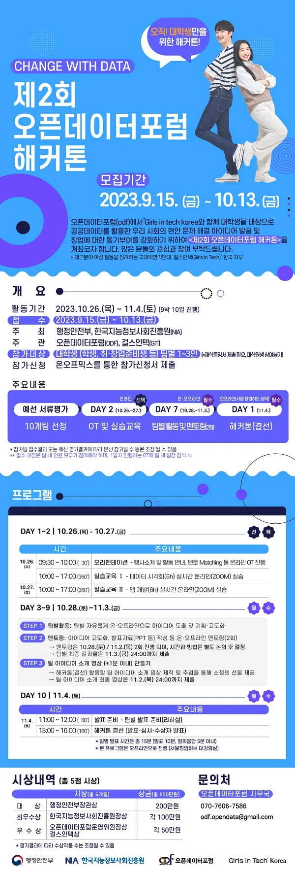 - 오픈데이터포럼(odf)에서 걸스인텍과 함께 대학생을 대상으로 공공데이터를 활용한 우리 사회의 현안 문제 해결 아이디어 발굴 및 창업에 대한